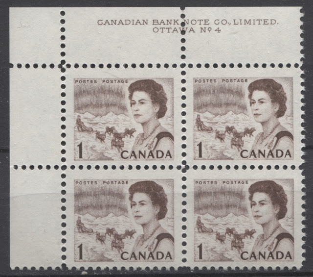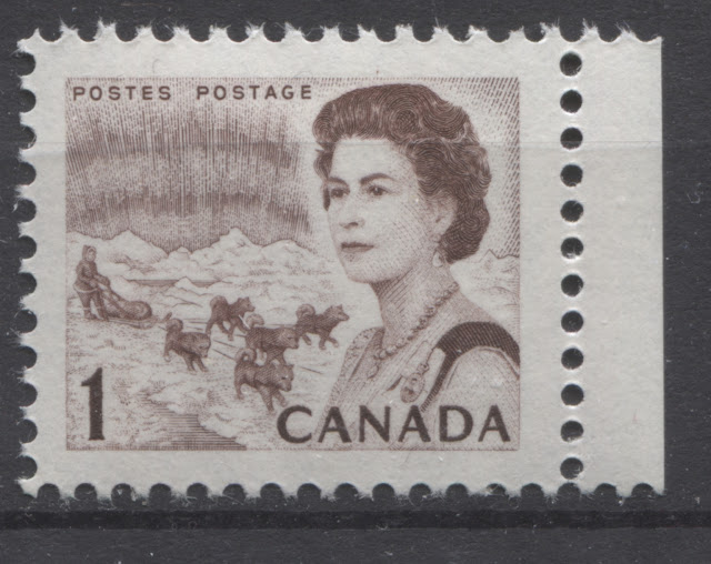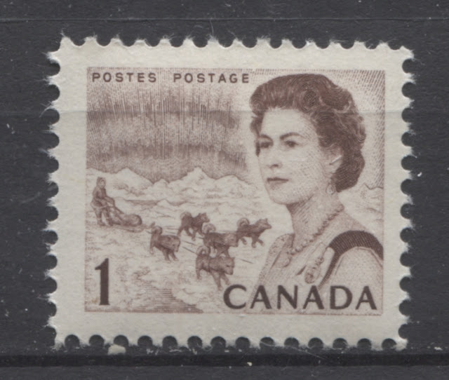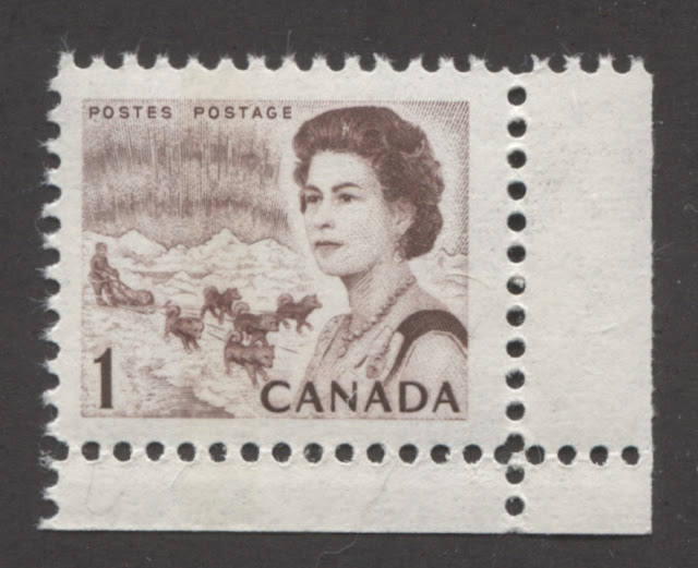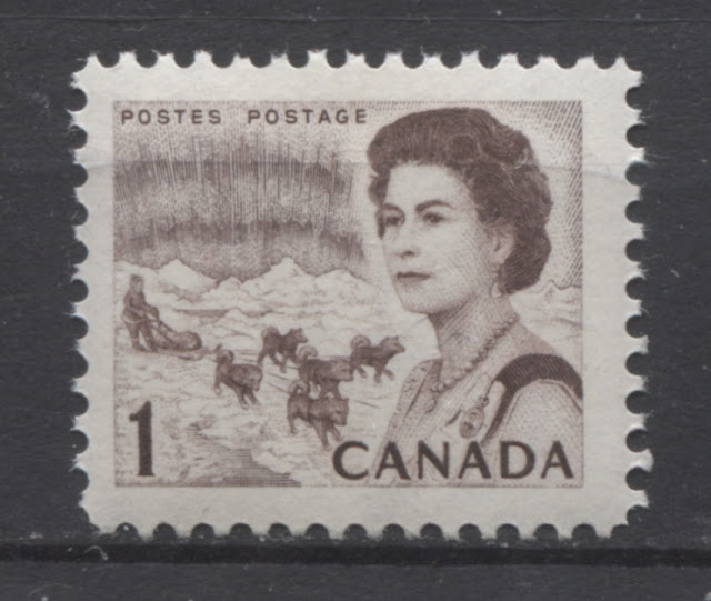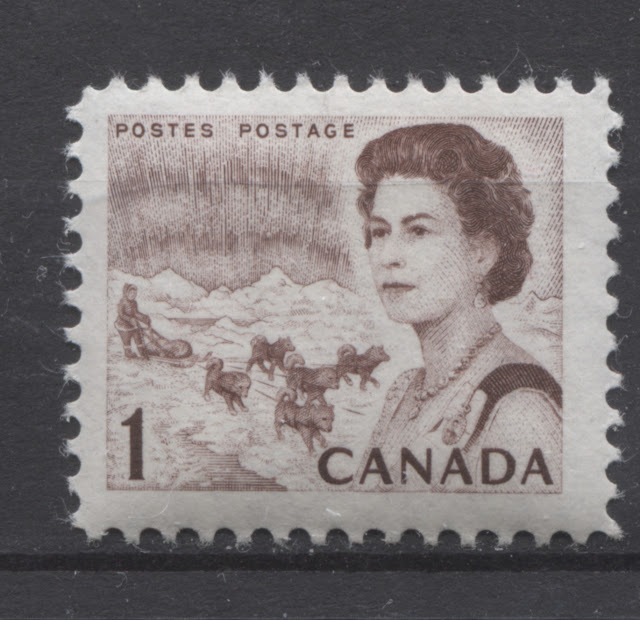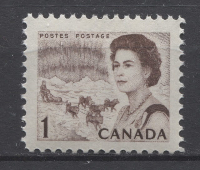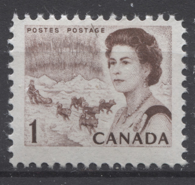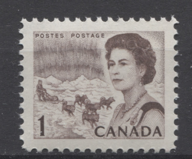 Today, we delve into the individual stamps of the fascinating 1967-1973 Centennial issue. We start with one of the most complex of the stamps from this issue: the 1c Northern Lights and Dogsled design. Perhaps the only stamp more complicated than this is the 8c slate Parliamentary Library.