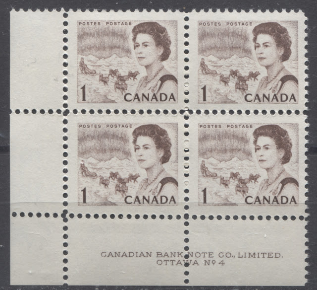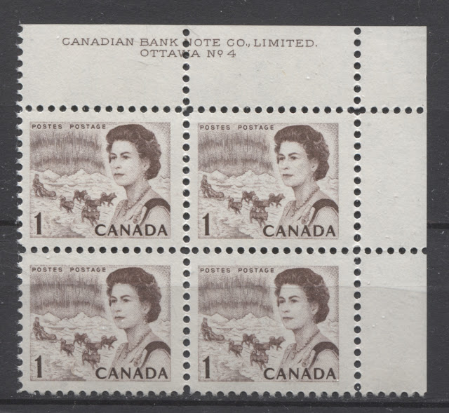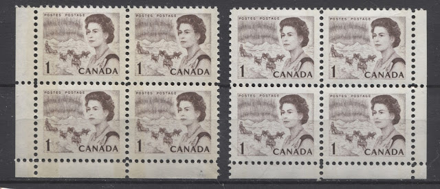 This is the most complicated of the stamps because it was in use from February 8, 1967 until the untagged PVA gum printing replaced it in December 1971, though the hibrite stamp appeared in June 1971. 4 different plates were used to print the stamps and if memory serves me correctly, plate 3 came into use in early 1970, while plate 4 came into use in late 1970-early 1971. So my starting point, must be to look at these plates first, and see which shades, paper and gum types are to be found. Then I can look at the plate 2 and plate 1 printings.