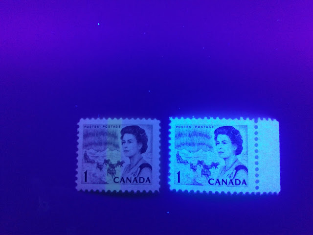 The tagging on these stamps is very difficult to see, both in normal light, and under UV. The above tagged stamp shows a very light yellow vertical band that starts just left of the "P" of "Postage" and ends just past the "G" of "Postage". It is much, much lighter than the earlier Winnipeg centre bar tagging, which was dark yellow by comparison. Under UV light, the bars appear a light brownish yellow, and there is no afterglow whatsoever, when the lamp is switched off. Again, that stands in contrast to the earlier Winnipeg centre bar tagging, which usually gives a 1-2 second afterglow after the UV lamp is switched off.
