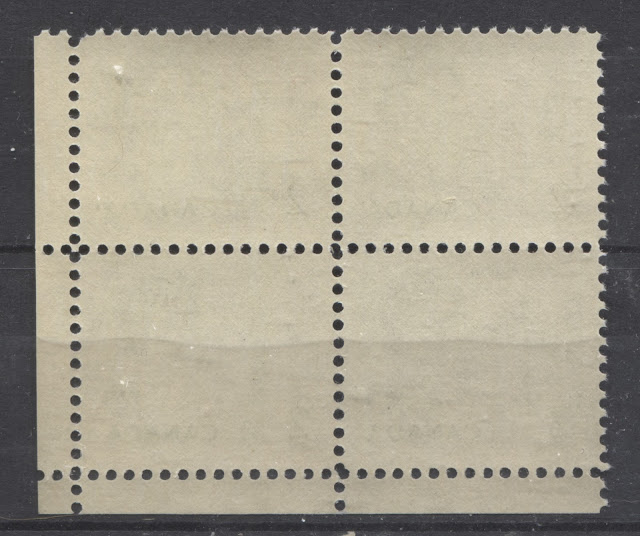 The Ottawa tagging on this value consists of 3 mm bars down the perforations between each column of stamps. According to Rose, 2 mm tag bars can be found as well. I have never seen these, but he states that they do exist. The spacing between the tag bars is 21.5 mm in the horizontal direction. Like the Winnipeg tagging, the Ottawa tagging does not appear to have been applied continuously to all six panes in the sheet layout. The picture below, of a 4c block with general Ottawa tagging shows the same type of gap between the tag bars in the lower selvage, from where one set of vertical tag bars ends, and the other begins.