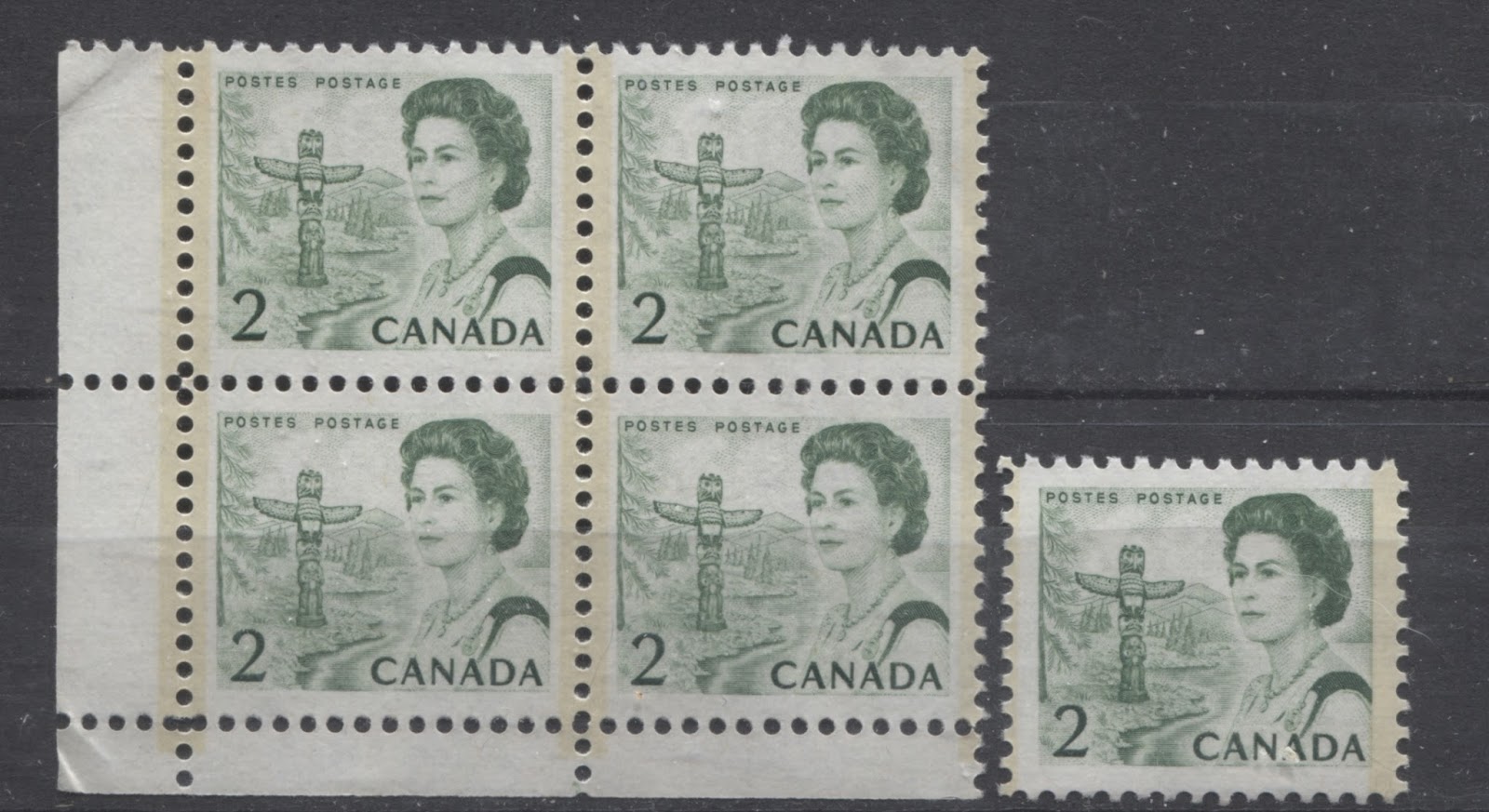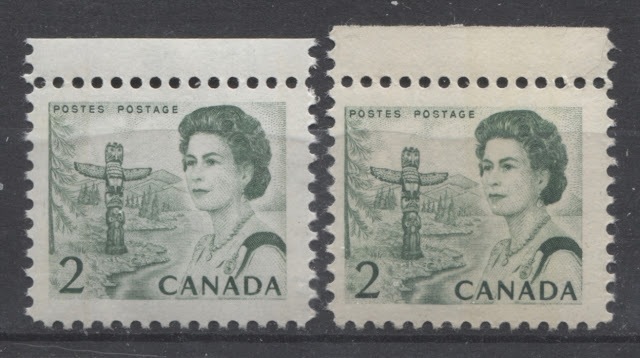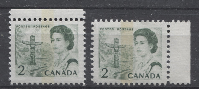 The remainder of this post will examine each of these basic varieties in greater detail. It should be noted that where I refer to the number of collectible stamps under each major heading, that I am not taking into account the 33 identifiable "blinky" flaws, or "eyes" of the totem pole in the design. If these are taken into account, there are really 33 times as many collectible stamps in each section. This does not necessarily extend to blocks in the same way, as the blinky flaws only occur on certain positions of each of the 6 panes, and most of these are not the corner positions.