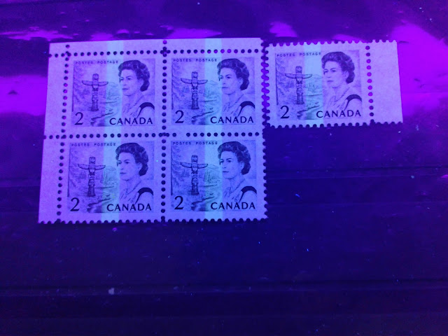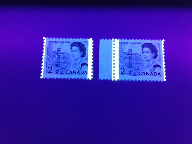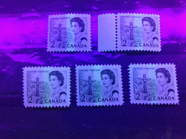 Today, I will be looking at all the printings of the 2c tagged stamps from this series. Unitrade's listings for the tagged examples of this stamp are quite extensive now, with no fewer than 7 varieties listed. This has grown over the years from just four when I was young, in the early 1980's. However, if you take paper colour under UV light into account, there are even more than 7. Today's post will hopefully shed light on this.