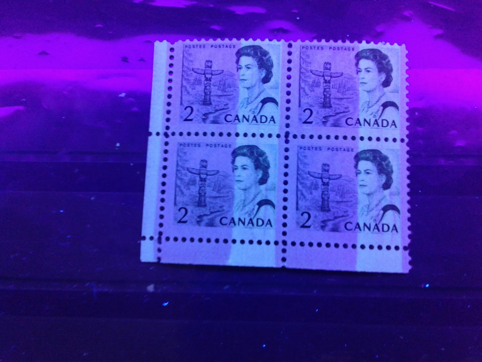 This picture shows quite clearly that the stamps in the block are much bluer than the single stamp on the right. Note the complete lack of fluorescent fibres as well.