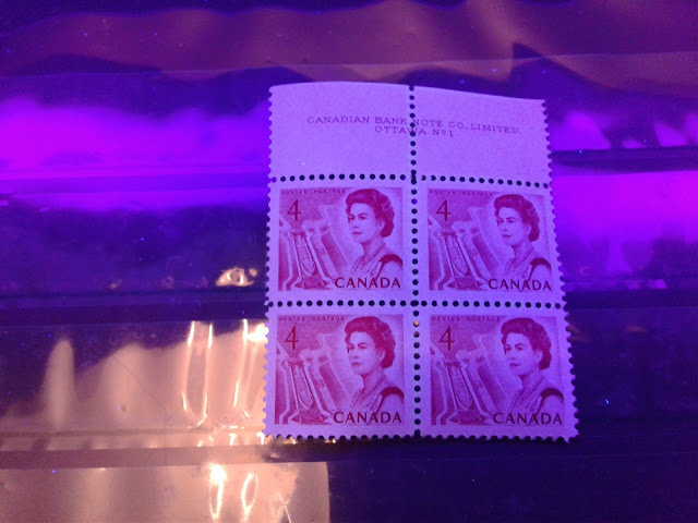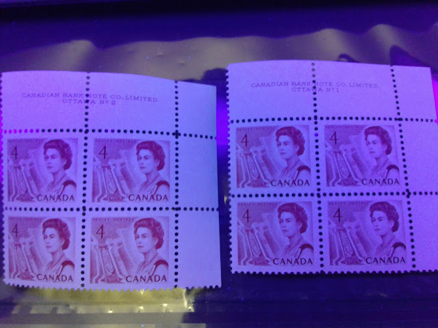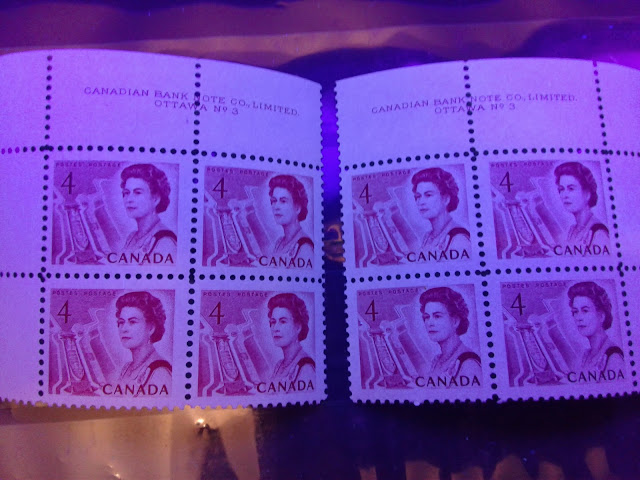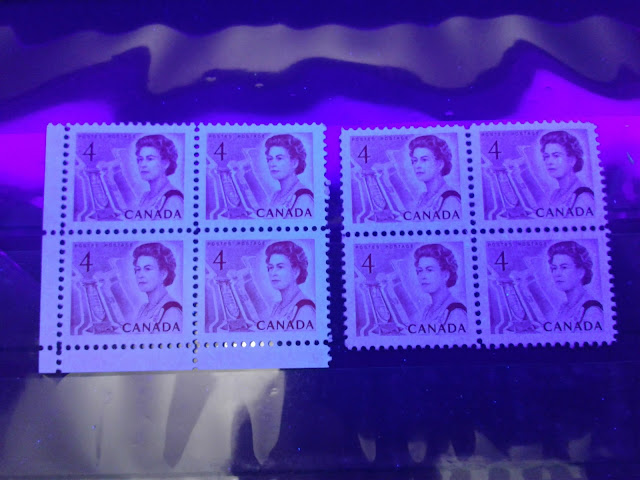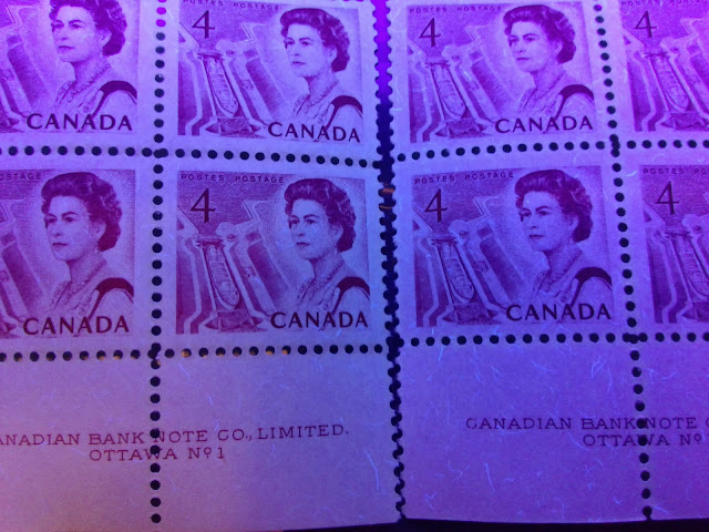 Unitrade only lists a single, low fluorescent paper for this stamp. However, as the pictures below show, I have found at least three varieties of paper, one of which is actually quite dull, being much closer to dull fluorescent, even though it is still considered to be low fluorescent.