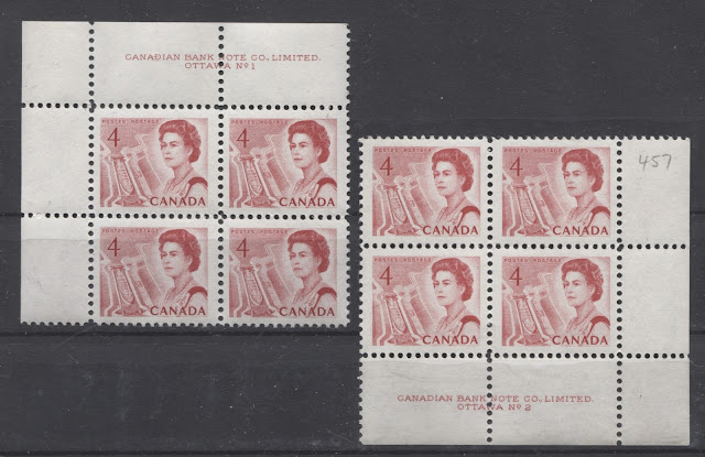 Today, I start examining the printings of one of the more complicated low value denominations in the series: the 4 cent carmine, which depicted a lock in the St. Lawrence Seaway, in Quebec. In addition to sheet stamps and coils, this stamp was also issued in three different booklets, as well as in the cello-paq miniature panes of 25, that sold for $1 each. The sheet stamps came with two different basic types of Winnipeg tagging, as well as general Ottawa tagging. It is a complex stamp, and three separate posts will be needed to deal with all the complexity. Today's post will be the first of these, and will examine all of the untagged sheet stamps.