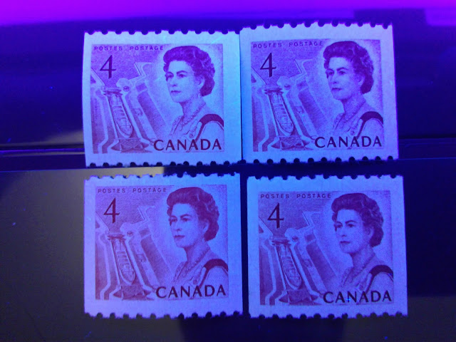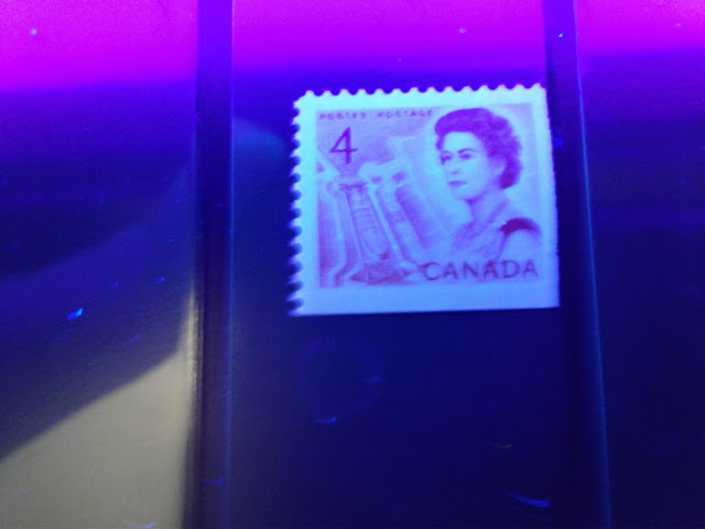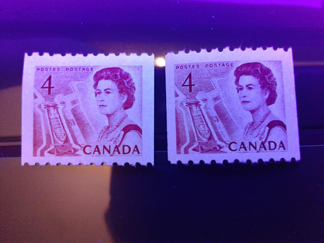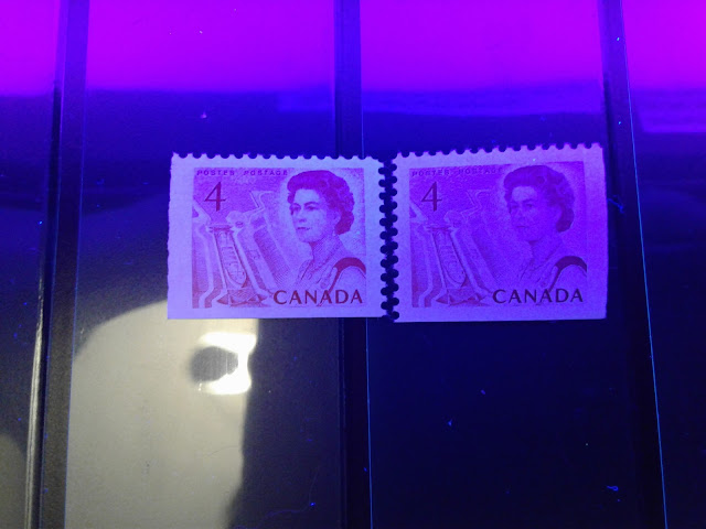 Unitrade lists two types of paper now, whereas until relatively recently, they only listed dull fluorescent paper. Now they list both dull fluorescent and non-fluorescent. The non-fluorescent paper is usually either a deep violet colour, or a deep violet grey under the UV lamp. The paper will also appear slightly different than the DF paper, with respect to its colour and gum, which is another way to identfy it positively.