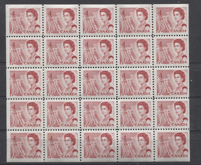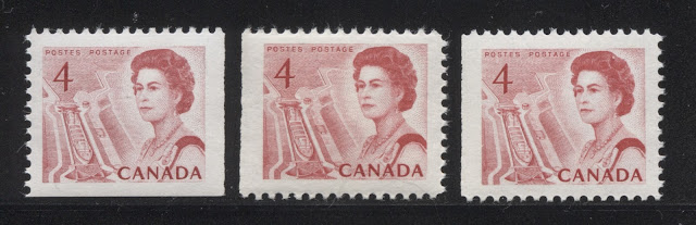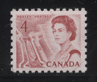 This week's post will examine the booklet stamps, miniature pane stamps and coil stamps of the 4c seaway lock stamp from this issue. Unitrade and McCann differ slightly in terms of the fluorescent paper varieties that they list for the booklet stamps, but otherwise, they are fairly close in terms of their listings. McCann does list two plate flaws on the BABN booklets, that are not listed in Unitrade, and these are described in this post.