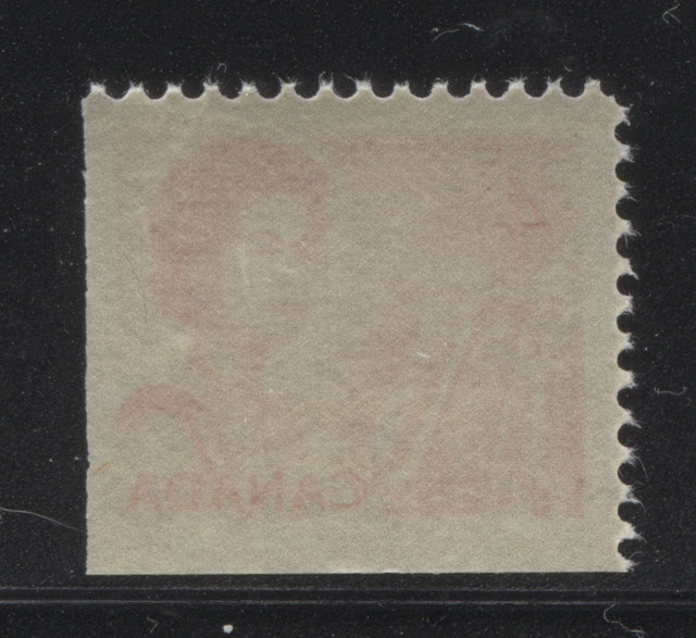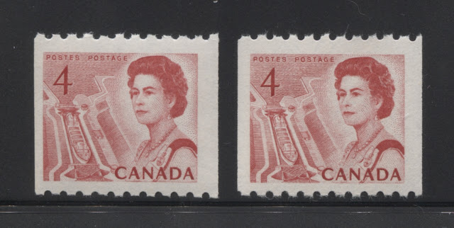The coils are listed by Unitrade as having all the usual varieties associated with CBN printed coils, such as jump strips, cutting guideline strips and repair paste-ups. However, in addition, there are narrow and wide spacing strips that exist. Unitrade notes the existence of these, but does not list them. Unitrade also lists two basic paper types: DF and LF-fl. However, as we shall see, there are several different types of paper, shade and gum on the coil stamps. So that it is possible to build a considerable amount of scope into a collection of them.
