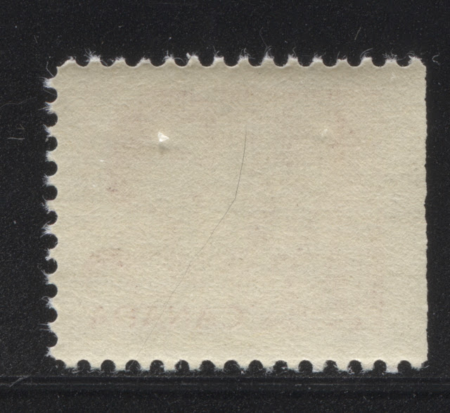 This is very different from the other stamps that came from the 25c booklet, in that there are many, many fewer fluorescent fibres in this paper, as compared to the stamps from the 25c booklet. Again, this paper is the third type described above, which shows clear ribbing on the gummed side.