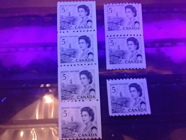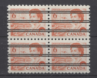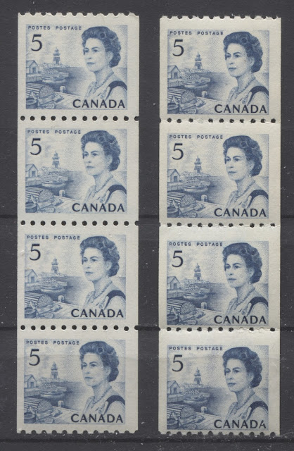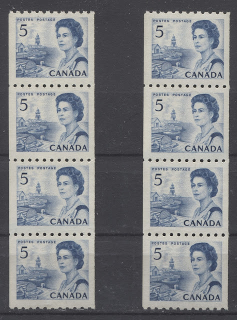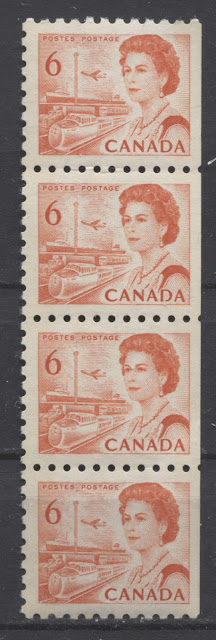 With that I mind, I will finish the 5c Atlantic Fishing Village stamp, by looking at the printings of the coil stamp, and then I will begin looking at the untagged sheet stamp of the 6c orange transportation design, with the sheet stamps perforated 10.