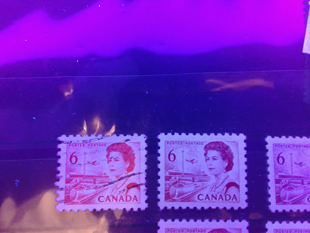 The picture below shows the first of the shades, which is the fluorescent orange ink, as listed in Unitrade. In normal light, the colour is red-orange that is neither bright, nor dull. Here is the colour under UV light when compared to a stamp with normal, non-fluorescent ink:
