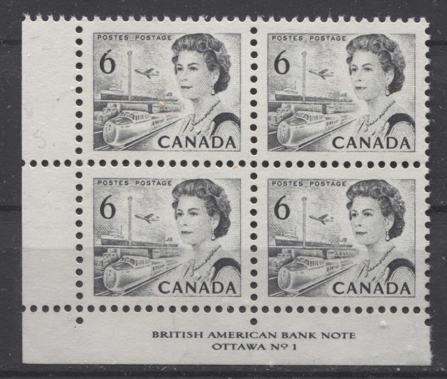 Of all the low values in the series, this is one of the most complex, along with the 8c slate Parliamentary library design. One of the reasons is that the sheet stamps were printed by both the BABN and the CBN, while there were several different printings of three basic stamp booklets, all printed by the BABN. This value includes one of the rarest Centennial issue items: the booklet of 25 on hibrite paper, which Unitrade values at $4,500, and which trades very infrequently. Because of this complexity, I will cover this value in 4 posts:
