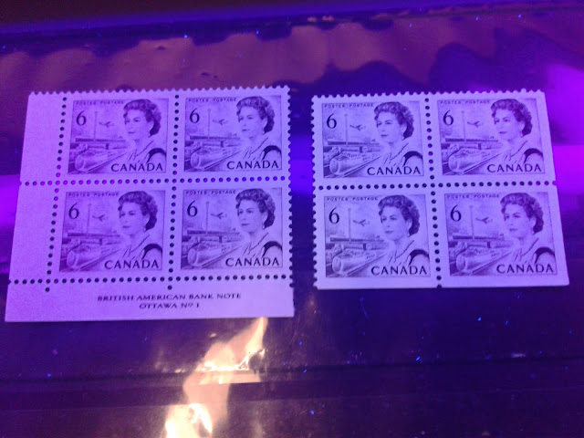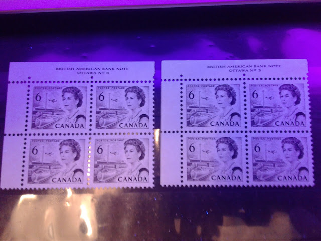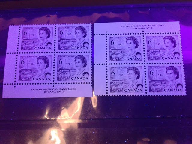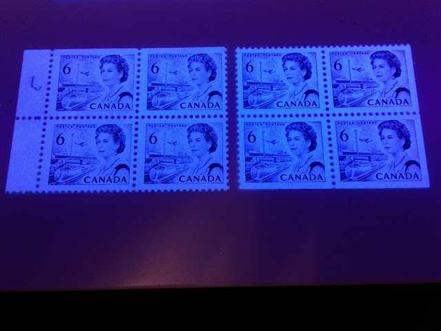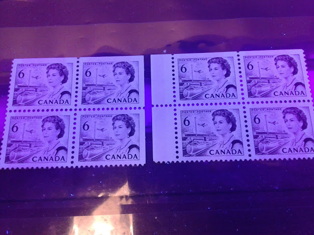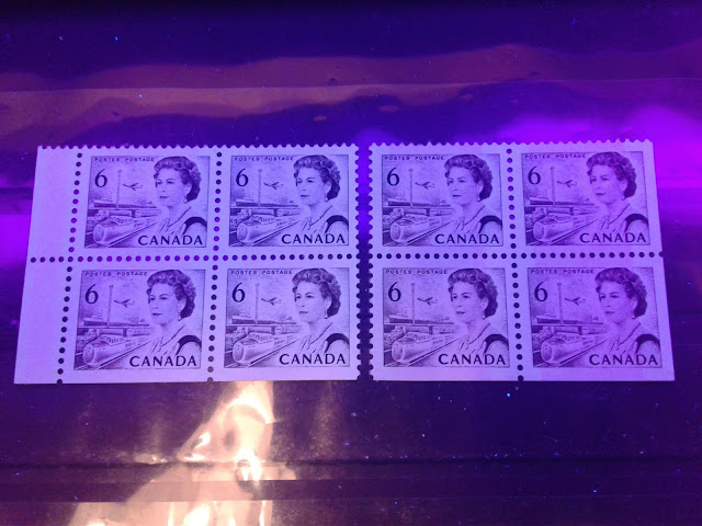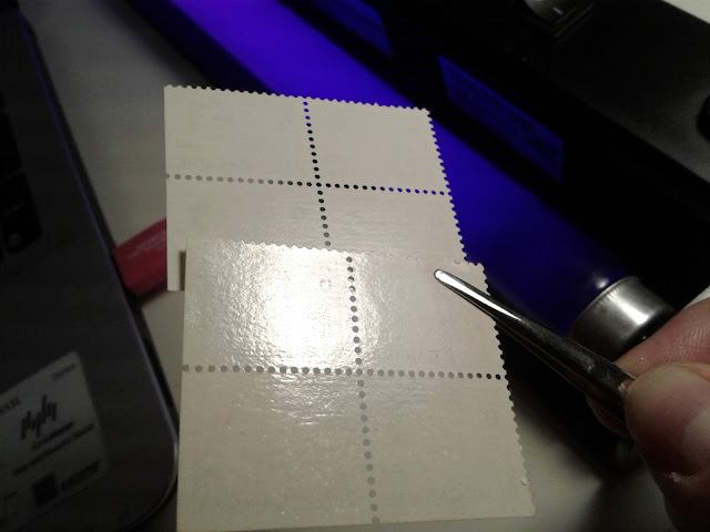 Can you see the tagging bars on these two blocks? It is very difficult isn't it? If you look in the left selvage tab of the right block, you should be able to make out a light vertical line where the paper appears slightly lighter under UV. This is the tagging bar. Then if you relax your gaze and look at the right side of the block, you should be able to just see the right tagging bar, and finally the middle bar.