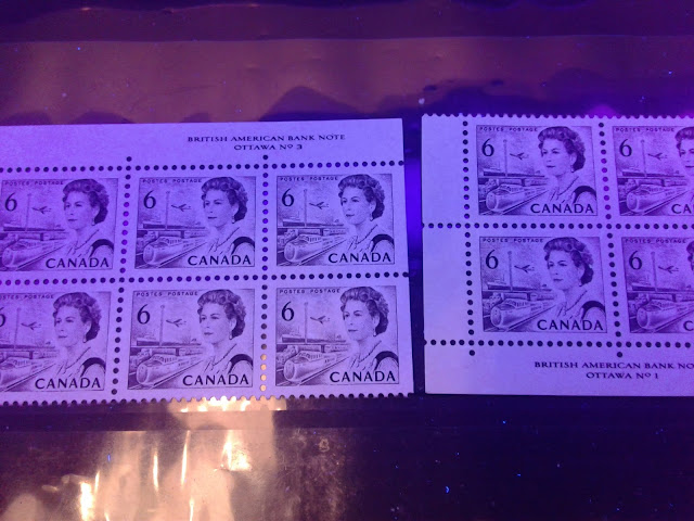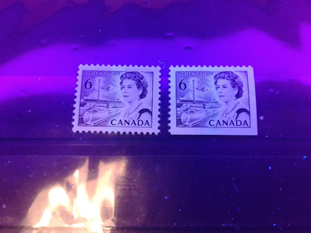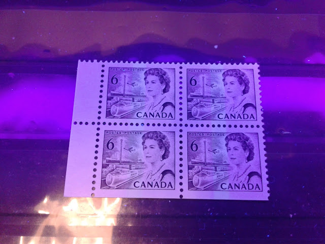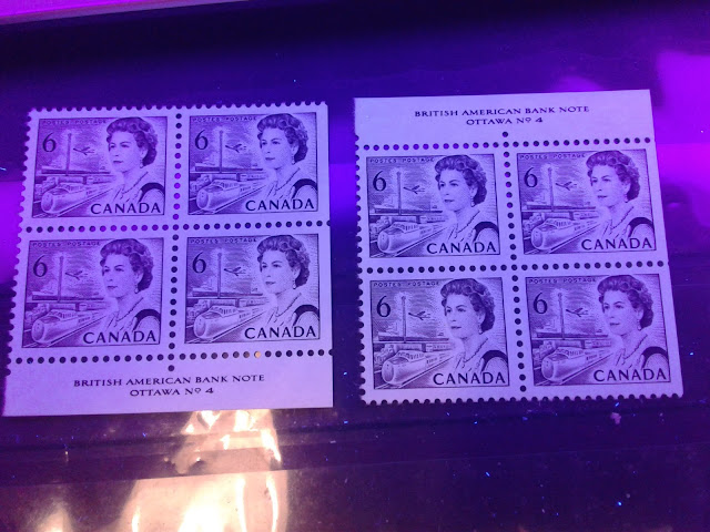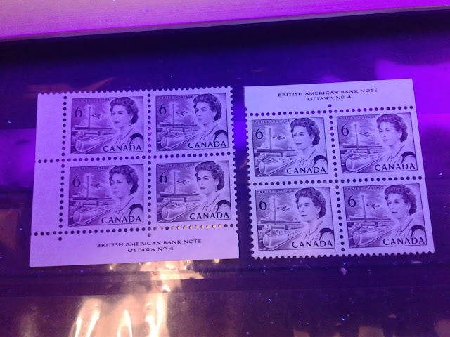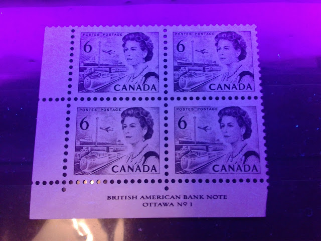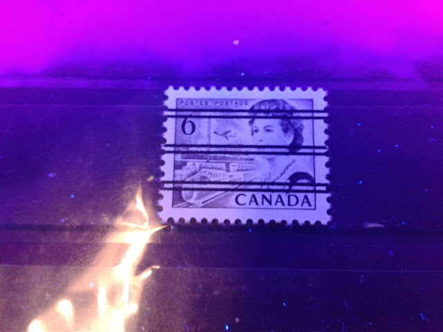 The Winnipeg tagging on these stamps is much easier to see, both in ordinary light, and under UV light, though I would say that it is not as deep as the Winnipeg tagging found on the low values printed by the CBN. The bars are 4 mm wide and were applied down the centre of each stamp in the sheet. This is one of the few Winnipeg tagged Centennial low values for which there are no known tagging errors.
