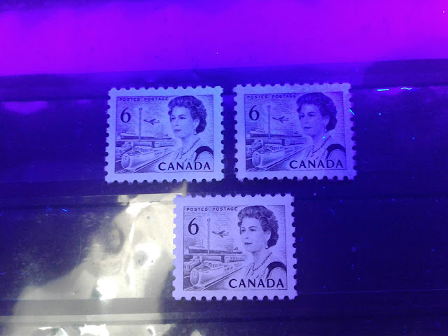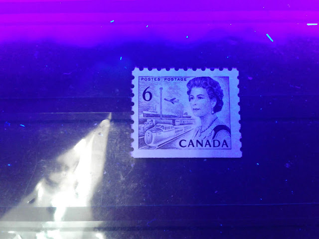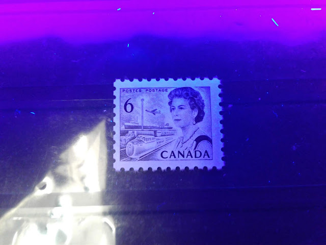 This leaves low fluorescent paper, and hibrite paper, which I haven't shown yet. Unfortunately I do not have a hibrite example to show here, but will add one when I come across it. Fortunately I do have two very slightly different low fluorescent papers: one smooth, with OP-2 tagging, and the other ribbed without tagging. The pictures below show both types. Please note that although the picture shows 1c stamps, the 6c stamps taken from the same booklet will look identical, in terms of their fluorescence. :