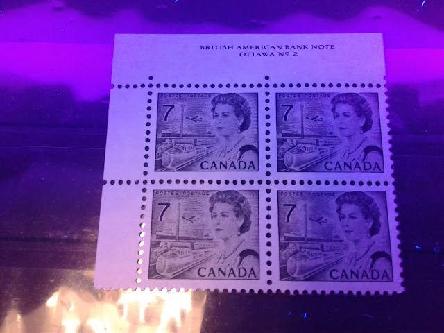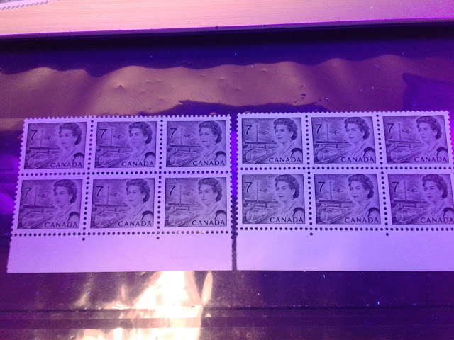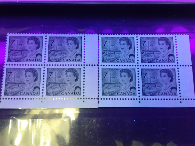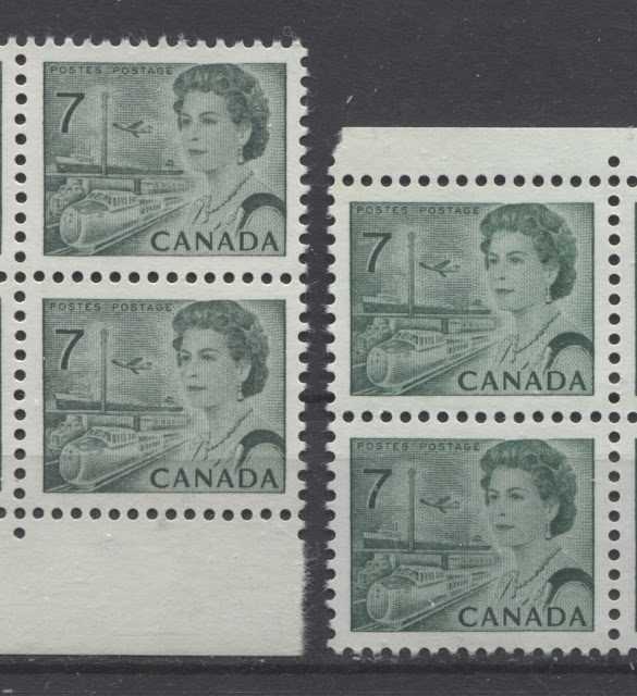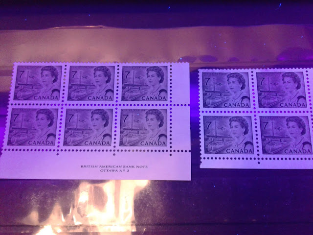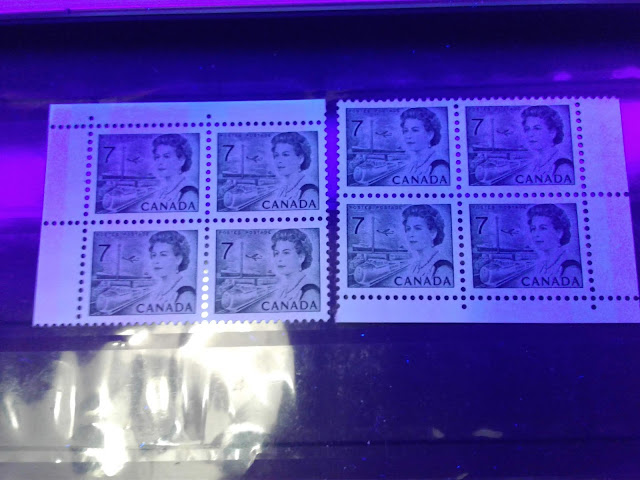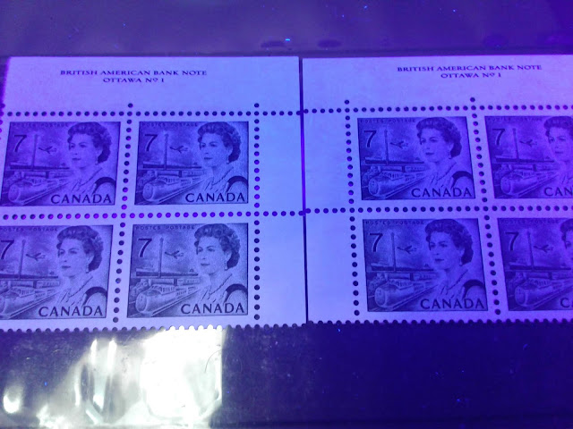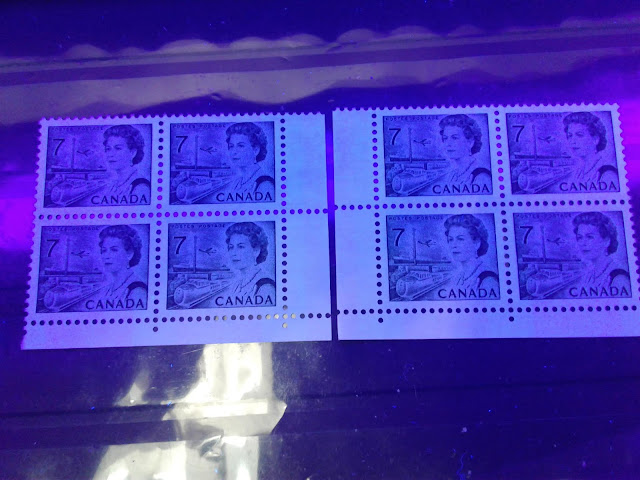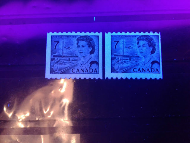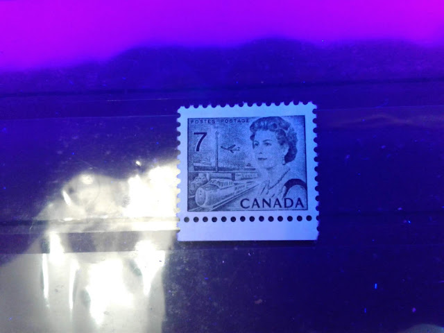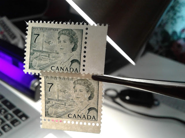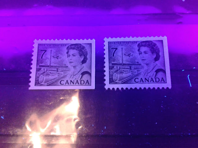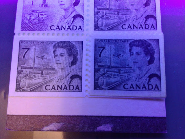 Unitrade lists only two grades of fluorescence on these stamps: low fluorescent (LF) and medium fluorescent (MF), while McCann lists these, in addition for dull fluorescent. All three of these descriptions are a little inadequate, I find, because they ignore the fluorescent fibres that are visible in the paper as well as the brownish woodpulp flecks.