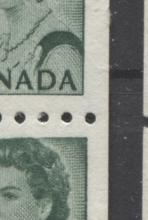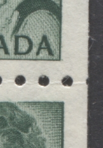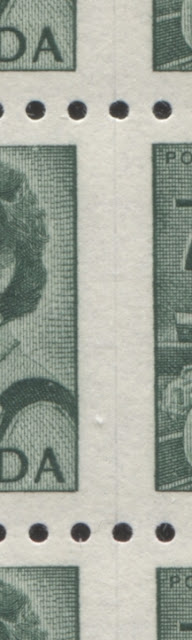 These stamps were tagged with Winnipeg taggant, down each vertical column of perforations. The bars are 8 mm wide, and there is a space of 16 mm in the horizontal direction between the bars. The taggant has a very light colour, just as it did on the 6c orange and the 6c black, making it very difficult to see on the stamps, as it does not discolour the paper too much. The easiest way to see it is to look for changes in the shade of green of the stamp near the right and left sides. The green will appear slightly brighter and yellower where the tagging crosses over it.