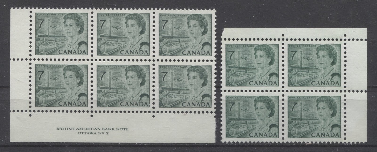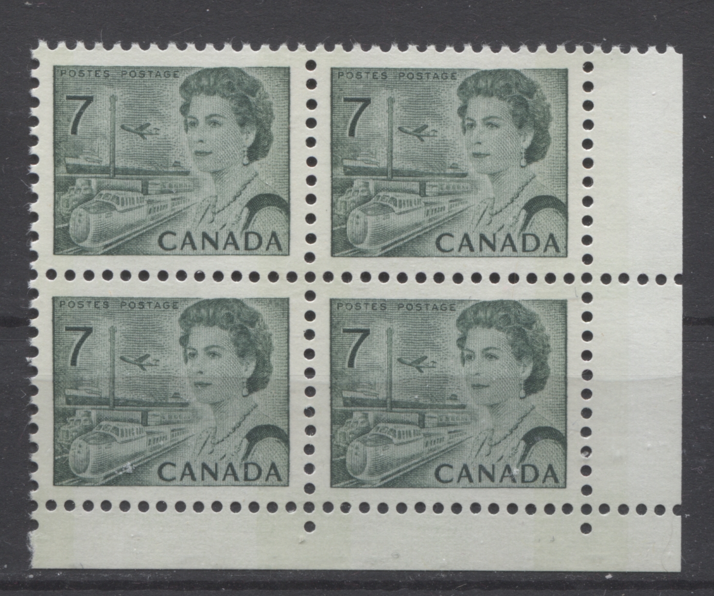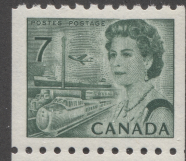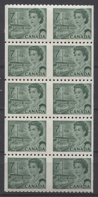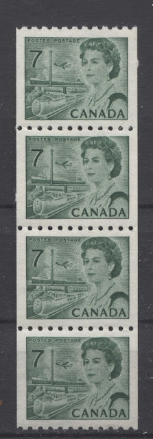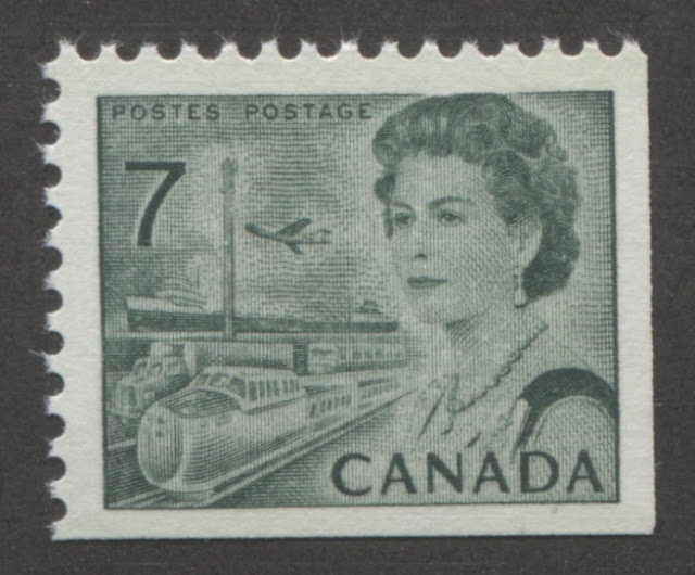 This stamp was issued both untagged and Winnipeg tagged in sheet form, and all of the sheet stamps known were issued with dextrose gum only. Three booklets: a 25c booklet (BK66), an experimental 50c booklet (BK68) and a $1 booklet (BK67) were issued with this stamp as one of the stamps in the booklet. The stamps from the 25c and 50c booklets are the only examples of this stamp known with PVA gum. The sheet stamps were printed from 2 plates, with plate 1 being scarcer than plate 2. There were also coil stamps that were issued in rolls of 100, just like the 6c stamps. The sheet stamps and booklet stamps were printed by the BABN and the coil stamps were printed by the CBN, just as was the case with the 6c stamps. It is also one of those stamps that up until very recently was thought to exist with few to no varieties. However, in recent years, Unitrade has begun to recognize some of the distinct paper varieties that exist. There are also at least two distinct shades of the green ink that can be found as well. However, these varieties have not, as yet gained any recognition in the catalogues.