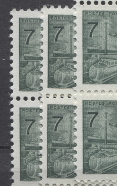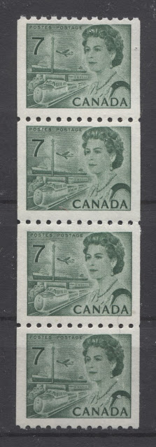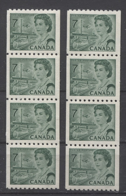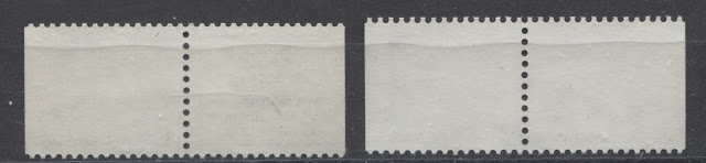 For this coil stamp, I have identified two types of paper, two levels of fluorescence and two types of gum. Each of these can be collected as a normal strip, a jump strip, a narrow spacing strip, a wide spacing strip, unsevered block, and as an imperforate pair - so 6 different ways. This means that there could be up to 2 x 2 x 2 x 6 = 48 collectible varieties of these coil stamps.