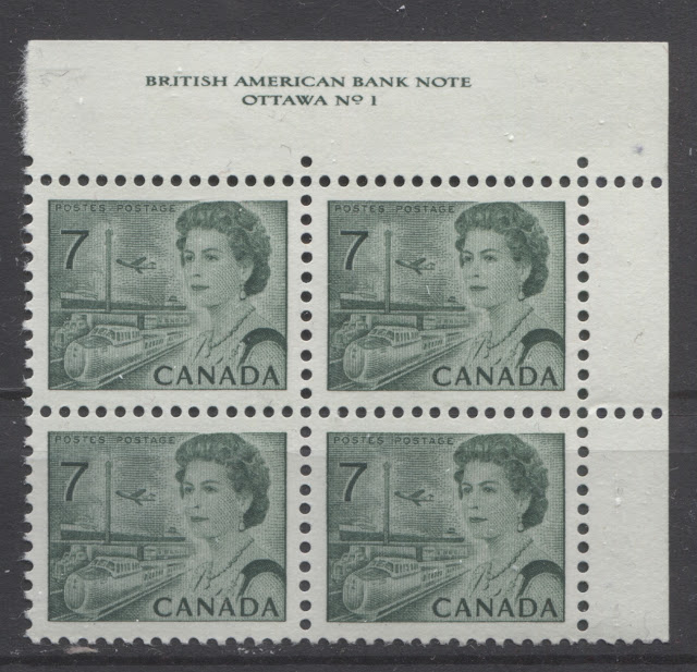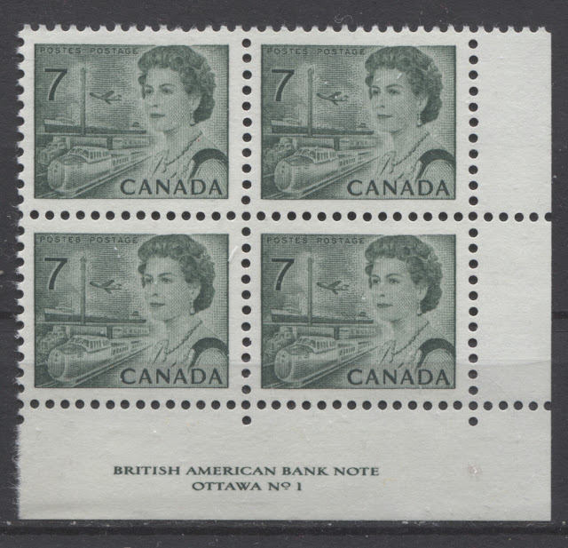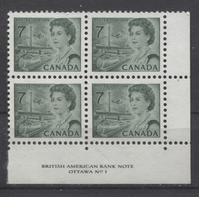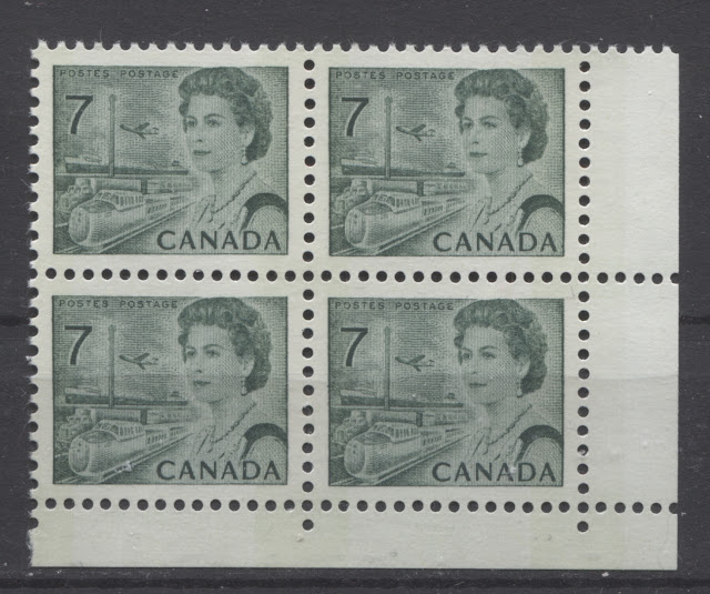 Today's post deals with the shortest-lived of the stamps of this fascinating issue: the 7c emerald green transportation stamp. The issuance of this stamp was brought about because of an increase to the first class letter rate on June 30, 1971, from 6 cents to 7 cents. This rate would again be increased to 8 cents on December 30, 1971, so that this stamp had a life of exactly 6 months.