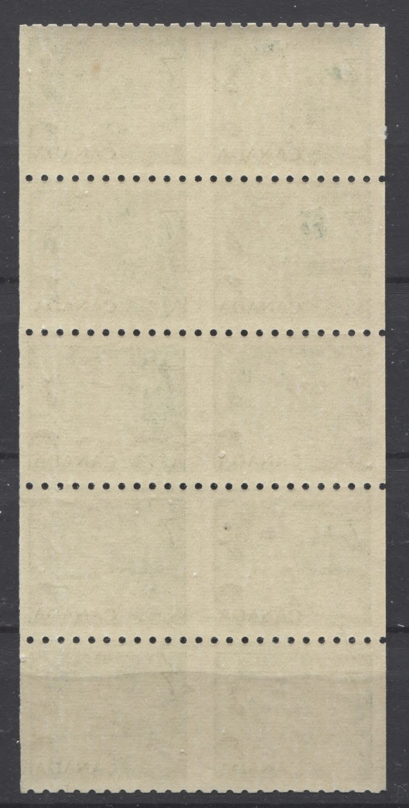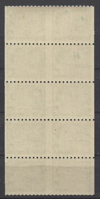 Like the 6c orange and 6c black, these coil stamps were produced in large sheets that scored in between the columns of stamps, and were rolled up into rolls of 100 stamps, that were joined together. The rolls were then snapped apart at the score lines to give a complete roll of stamps. However, it was possible to unroll two or more unbroken rolls and obtain blocks that appeared to be for all intents and purposes partially imperforate. They are not partially imperforate though, as the score line is present between the vertical strips in such a block. Blocks in which there is no trace of the scoreline present are genuine partially imperforate errors, and are very scarce, and worth significant premiums. The scored blocks however, are more of a novelty and not really worth a significant premium, although they are fun to collect. The scans below show a typical unsevered block with a visible vertical scoreline on the front: