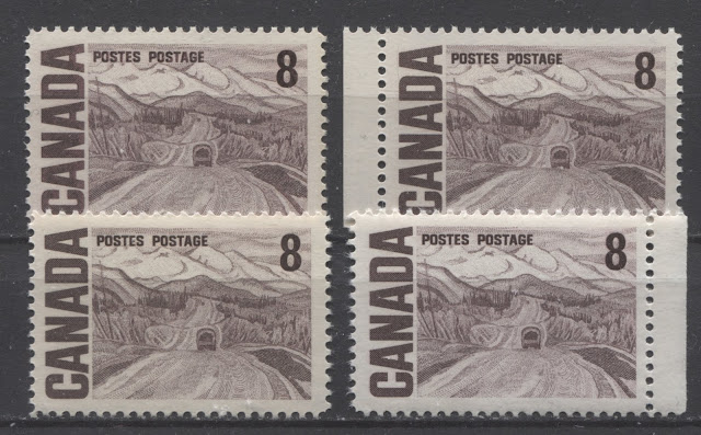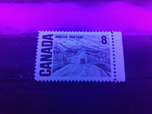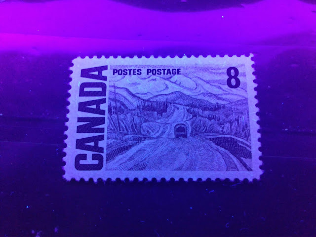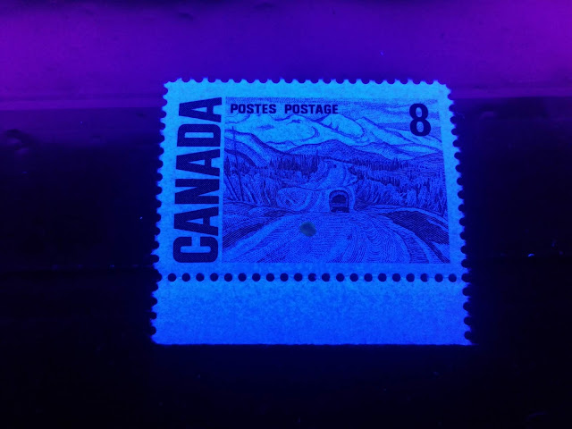 The stamp was printed in shades of purple brown and depicts the painting "Alaska Highway", by A.Y Jackson. It was only a high value during the period, when the first class letter rate was less than 8 cents. When the letter rate increased to 8c on December 30, 1971, this stamp ceased to be issued and was reduced to low value status and replaced by the 8c Parliamentary Library design that was the subject of my posts for the past several weeks. Because it was replaced at the end of 1971, it is not known to exist with PVA gum. Though it seems curious that it doesn't since there were plenty of stamps issued in 1971 that at least were the experimental spotty gum and some PVA. Interestingly it is one of the few stamps in the set that was never issued in tagged form either.