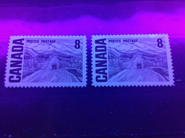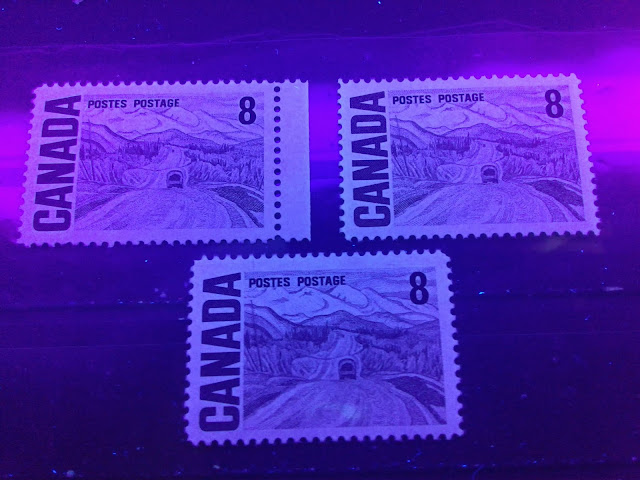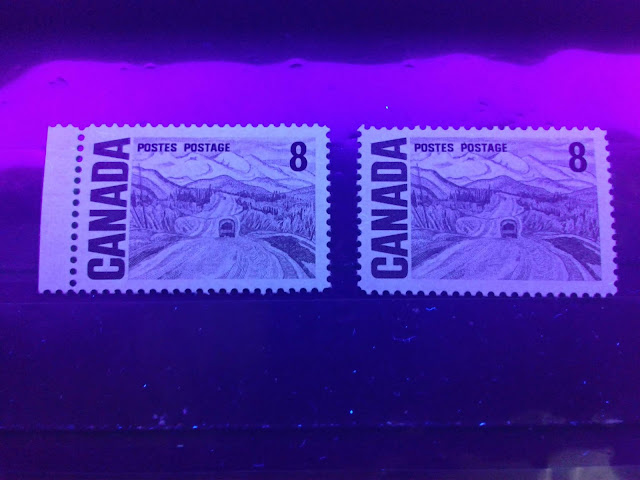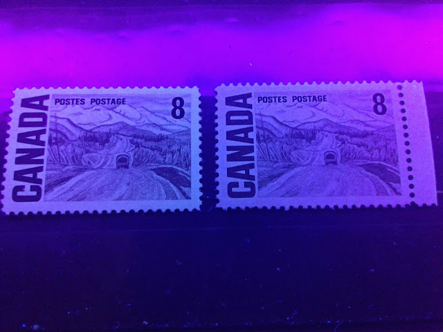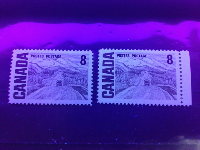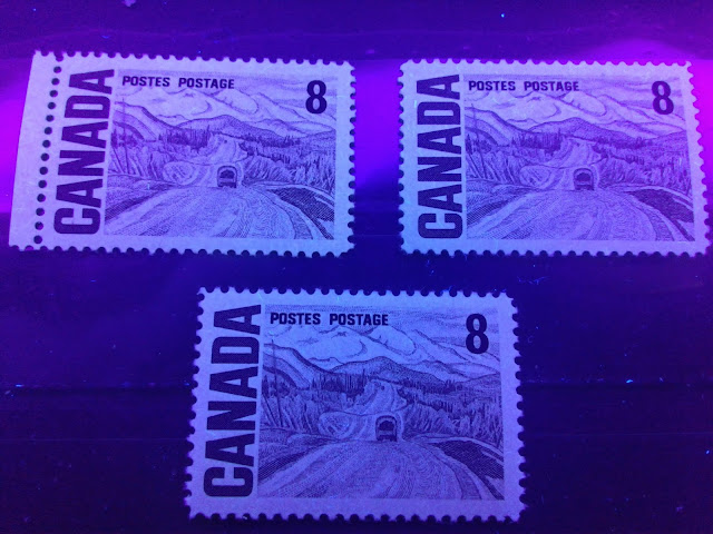 Unitrade originally did not list any varieties for this stamp, but over the years variations in the paper fluorescence have been added until now there are four varieties of fluorescence listed. In addition, a plate flaw called the "plastic flow" variety is listed now, which will be shown in a separate section. However, these listed varieties do not reflect all that there is to collect with this stamp. In addition to paper fluorescence, there are at least two shades, several variations in the dextrose gum found and differences in other characteristics of the paper besides fluorescence. Today's post will deal with all of these things.
