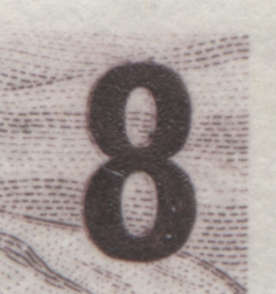 Here you can clearly see the additional outline along the left outside edge of the "8" and the right inside edges. It is quite a scarce and sought after variety. As best I can tell, it can exist on all paper and gum types, as well as all shades. A separate study devoted to this variety would help confirm whether there are some varieties that it does not exist with, or if others predominate the mix.