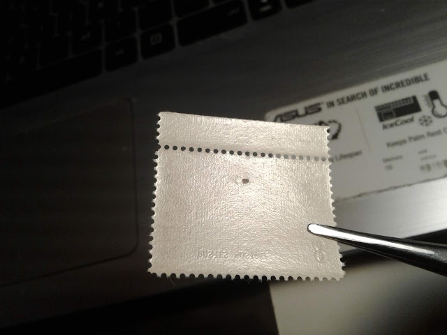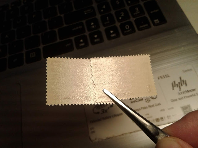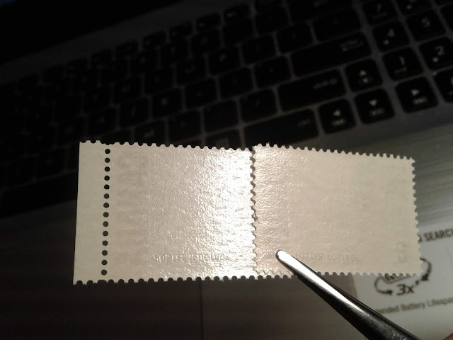 The picture below shows a single close up picture of the low fluorescent stamp, which shows the fluorescent fibres more clearly: