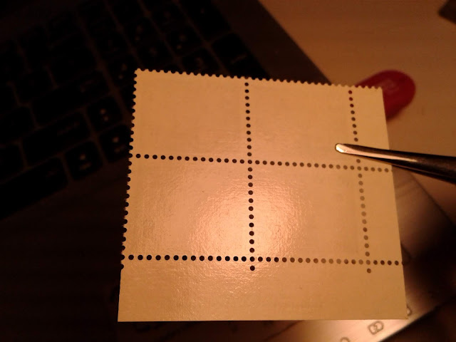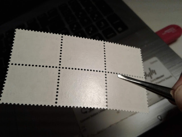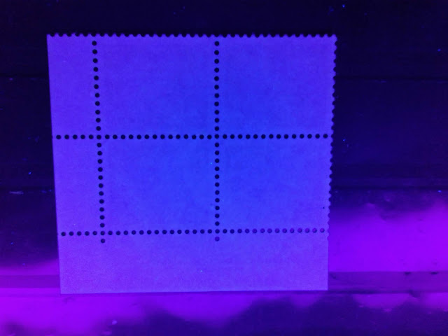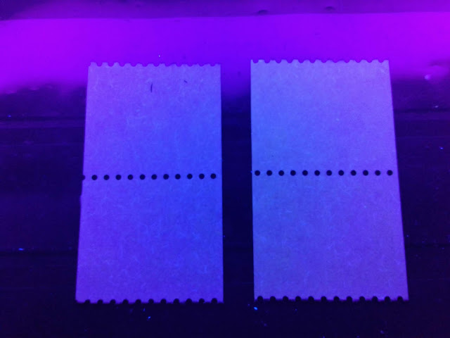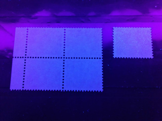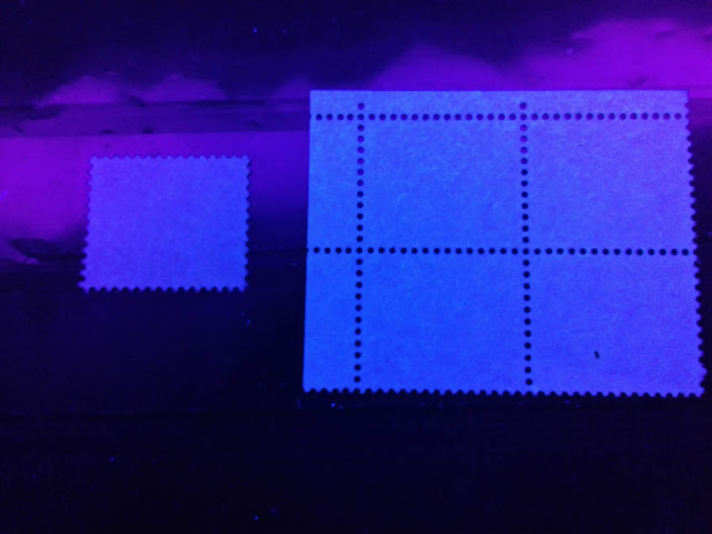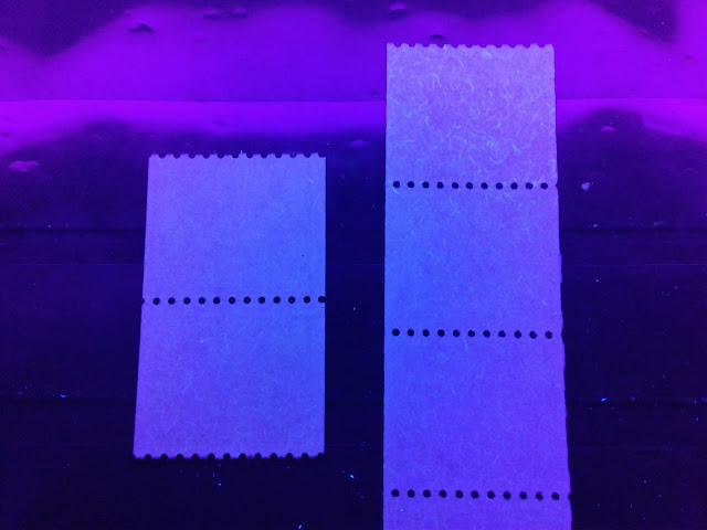The block on the left is the same paper as the single stamp on the right in the previous picture. The block on the right is the dull fluorescent cream paper.