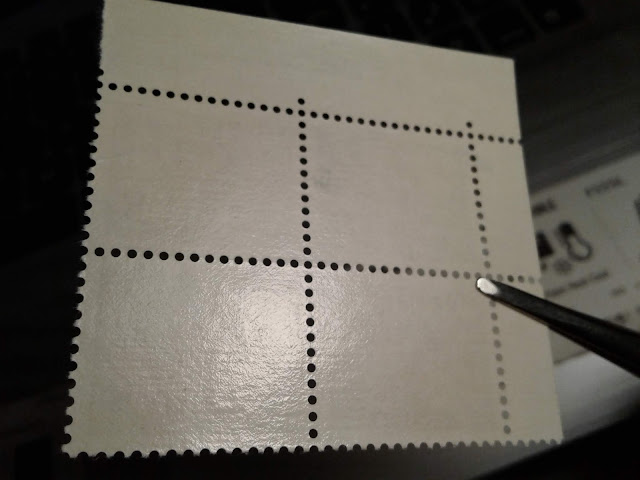 The 75+ constant roller flaws that were mentioned on the dextrose gum stamps are also found on these stamps as well, though it is not clear whether all 75 can be found with each of plates 4, 5, 6 and 7, which were the plates used to print the PVA gum stamps. All of the untagged stamps appear to have come only from plate 4 however.