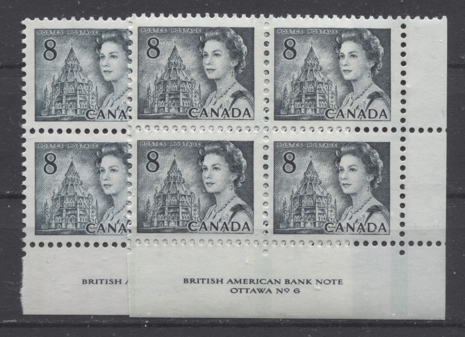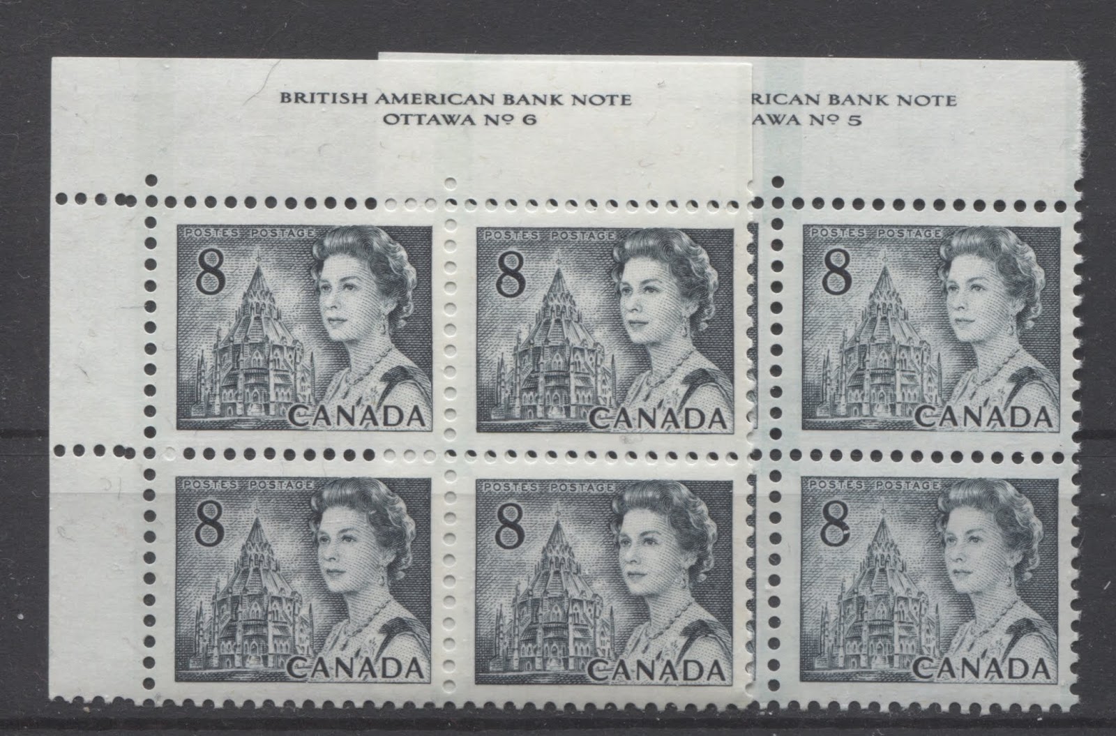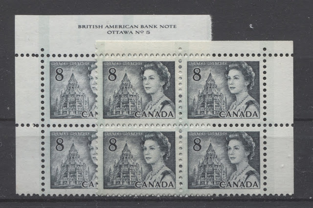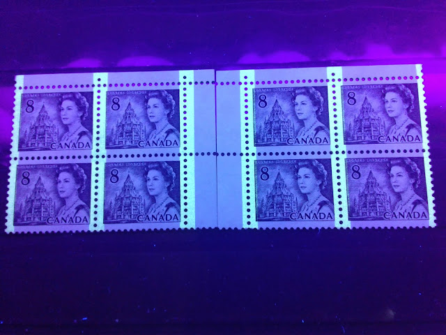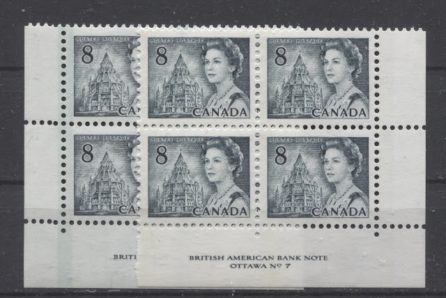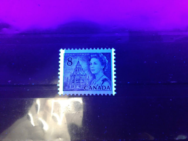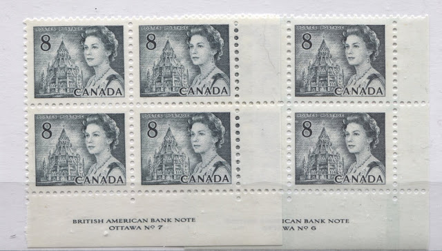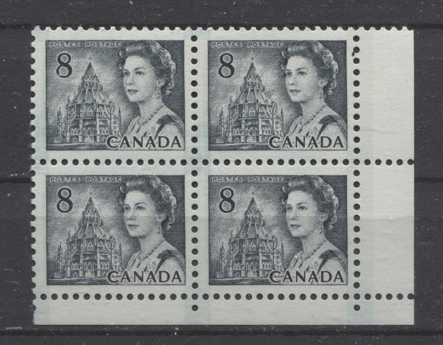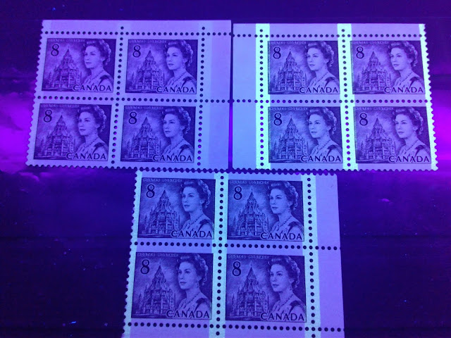 Today is the third of four posts dealing with the last of the low values of this issue: the 8c Parliamentary Library stamp. In this week's post, I will be looking at the printings of the sheet stamps that were Ottawa tagged. According to Unitrade, the sheet stamps were first issued at the same time as the Winnipeg tagged stamps, on December 30, 1971, using the then unstable OP-4 tagging compound. This compound migrated both through the stamps and onto any porous material they came into contact with. The result was that the tagging bars faded to the point that they were useless to the mail sorting machines, so that by late 1972, the taggant compound was replaced by a more stable OP-2 compound. The new printings with the more stable OP-2 tagging were issued in 1973 between April and July, well into the period covered by the new Caricature issue that replaced this one, but before the release of the low values of that set.