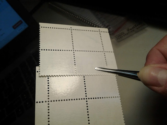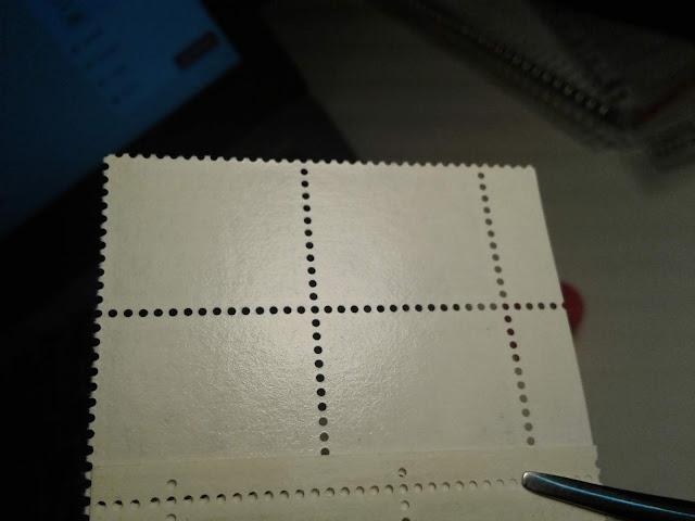 The perforation on these stamps remains at comb 12.5 x 12, following the exact same configuration as the earlier printings, in which the side margins of the sheets are fully perforated through, but only a single extension hole appears in the top and bottom sheet margins. I have not found any variation in the gauge, or configuration of the perforation. However, there is one important difference: the perforations have been made using more than one strike of the comb perforator. This is apparent from looking at the side perforations. Here, we can see an uneven spacing and misalignment of the horizontal perforations where one comb strike ends and the other begins. This can be seen in the scan below: