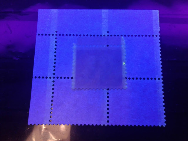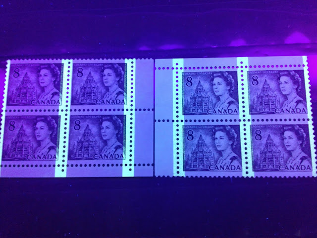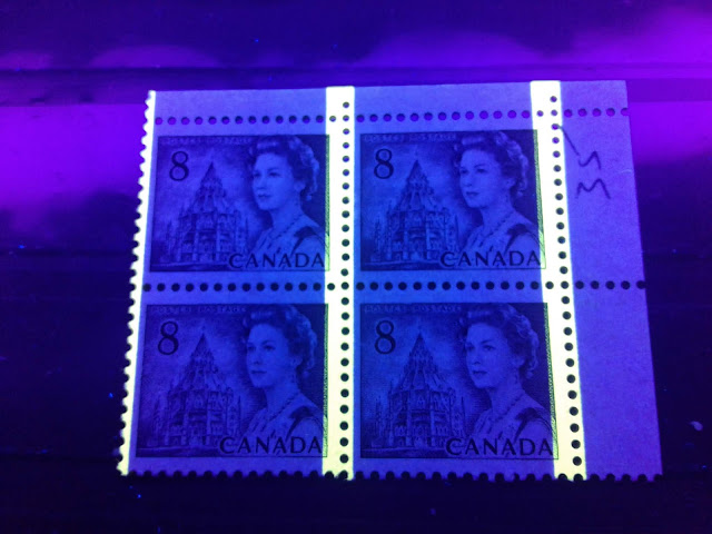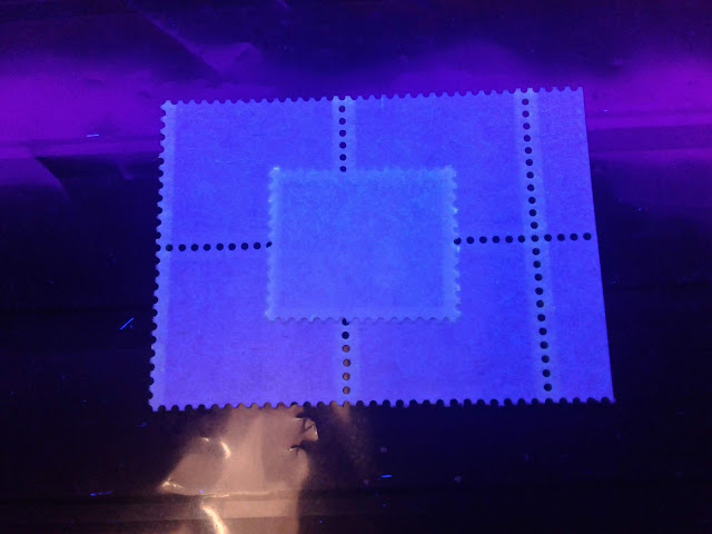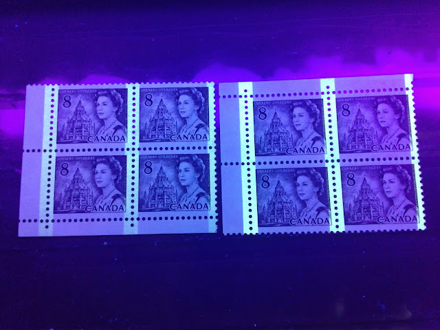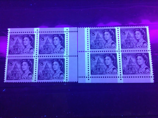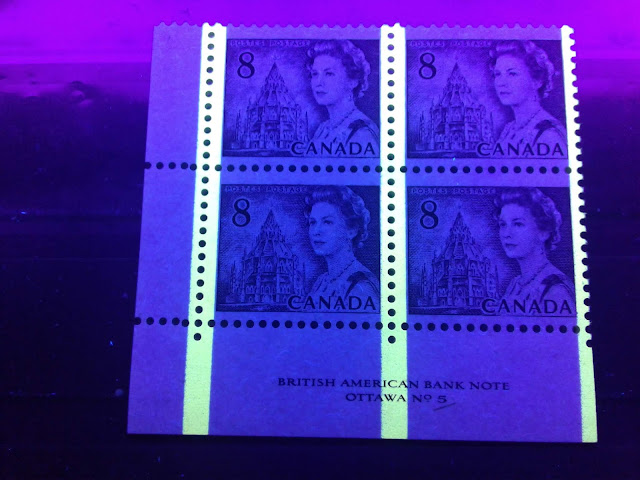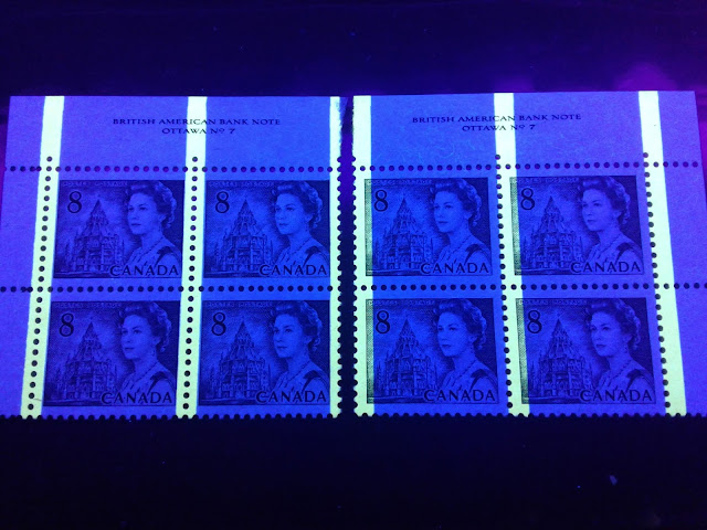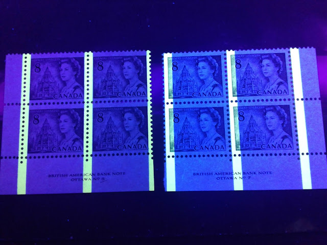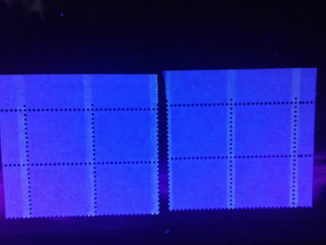 I have found an additional variety of the paper used for the plate 7 printings that has the same horizontal weave pattern and smooth printing surface that is usually associated with this plate. Unlike the high fluorescent paper and medium fluorescent paper that is usually found on stamps of this plate, this paper is low fluorescent. Specifically, this paper is low fluorescent bluish white and contains a low density concentration of low fluorescent fibres, a sparse concentration of medium fluorescent fibres and a very sparse concetration of brownish woodpulp fibres. The picture below shows this paper on a single stamp, against a typical plate 7 plate block printed on the high fluorescent paper: