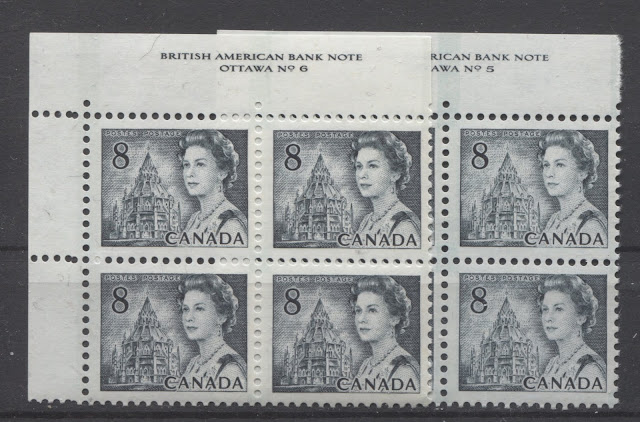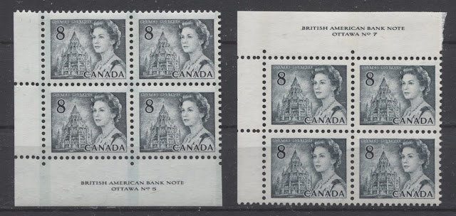At first glance it would seem that bank corner blocks n smooth paper from plates 5 and 6 will be more or less indistinguishable from one another. However my discussion of the shades of ink used to print these stamps does suggest that the plate 5 and plate 6 blocks should be distinguishable on the basis of their ink shades.