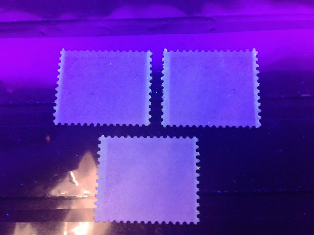Under UV light, the tagging is usually a bright yellowish green colour, when no migration of the taggant has taken place. As the tagging fades or migrates, the colour fades until it is basically a very pale bluish white. It is easy for those with less experience dealing with these stamps to think that faded tagging bars are actually untagged stamps, when in fact they are not. The picture below shows three examples of this tagging: