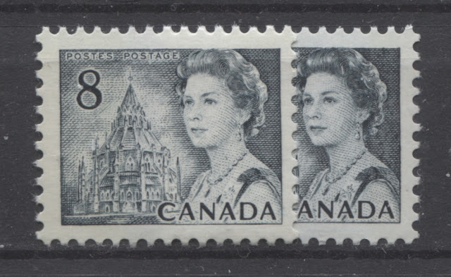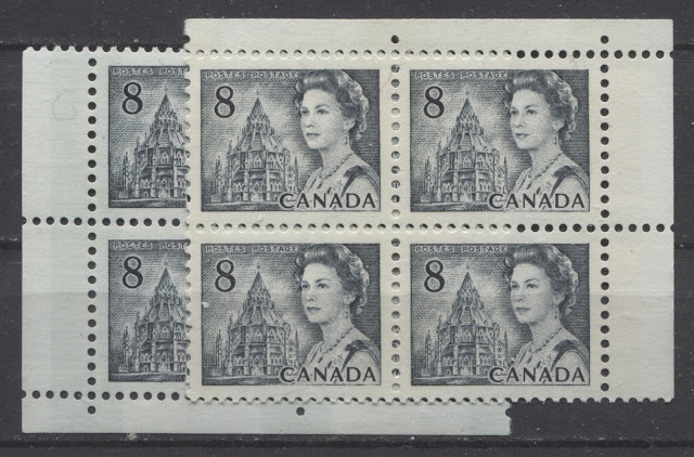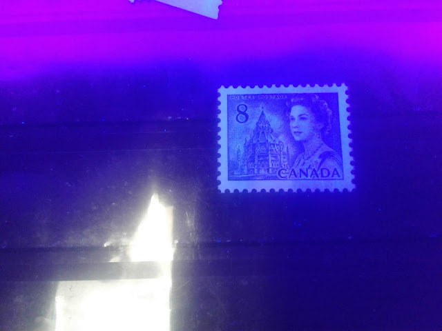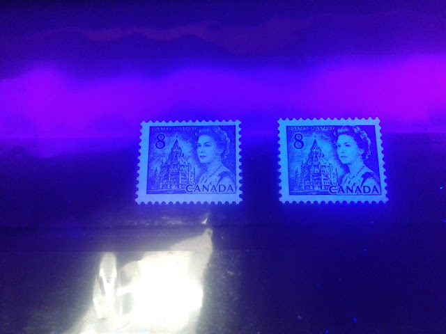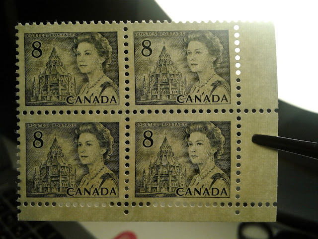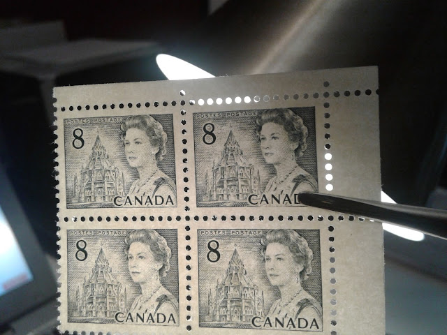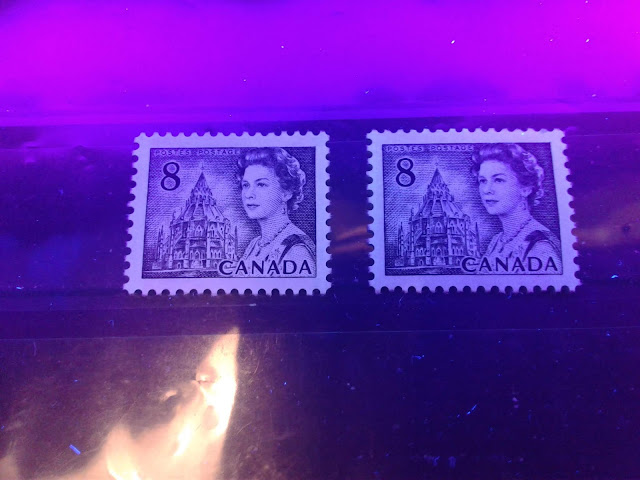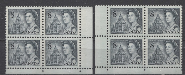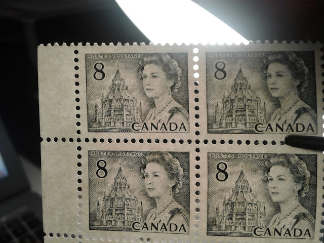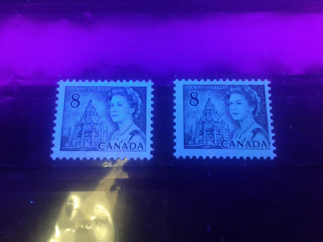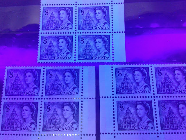 This weeks's post continues my exploration of the printings of the 8c slate definitive from this series, which depicts the Parliamentary Library from the centre block of the Parliament Buildings in Ottawa. This week, I will examine the printings of the Winnipeg Tagged sheet stamps. The Winnipeg tagged stamps were issued with both dextrose gum and PVA gum. The dextrose gum printings were released at the same time as the untagged stamps on December 30, 1971. However, the PVA gum versions were released between July 1972 and November 1972, after the General Ottawa tagging replaced Winnipeg tagging as the standard tagging, which is interesting. This may account for the expensive nature of the printings on high fluorescent paper - because they were likely provisional printings made to fill in supply fluctuations of the Ottawa tagged stamps that happened when it became apparent that the OP-4 taggant that was being used for the Ottawa tagged stamps was unstable and needed to be replaced by a more stable compound.