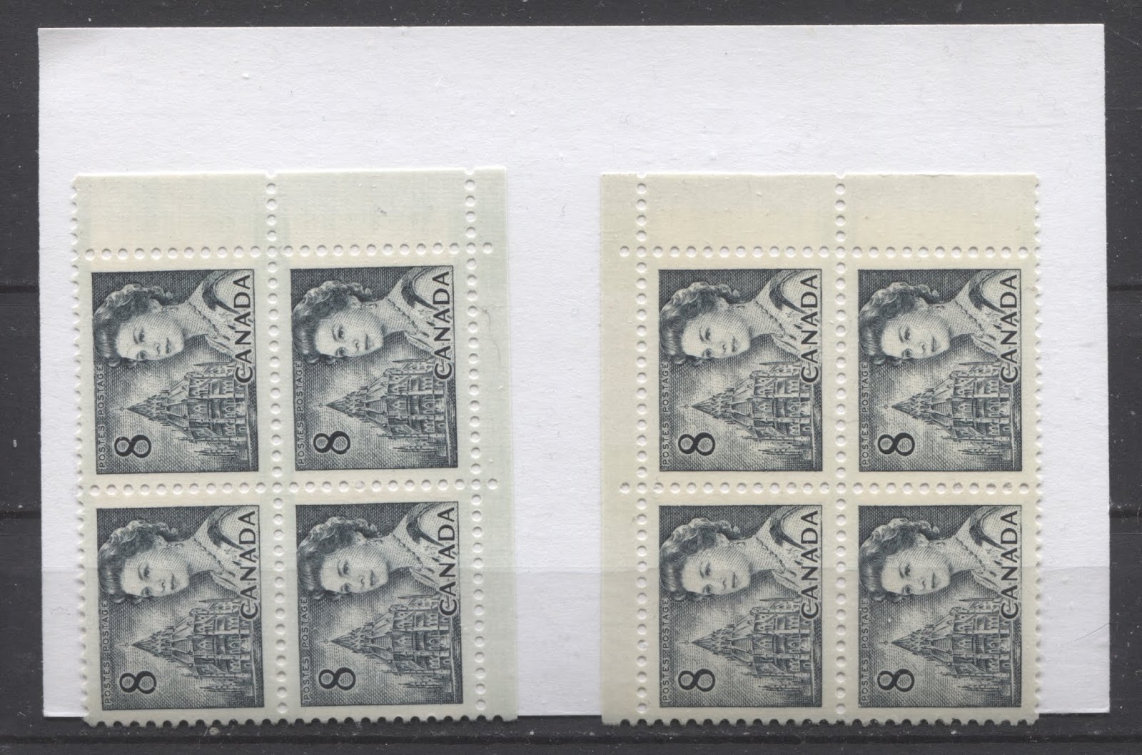 In normal light the tagging bars are somewhat difficult to see on most stamps, and appear as a slight discolouration of the paper on the sides of the stamp. However, occasionally the slate ink has coloured the paper and tagging, causing it to take on a light bluish appearance and thus making it easier to see. The scan below shows two different blocks with both types of tagging: