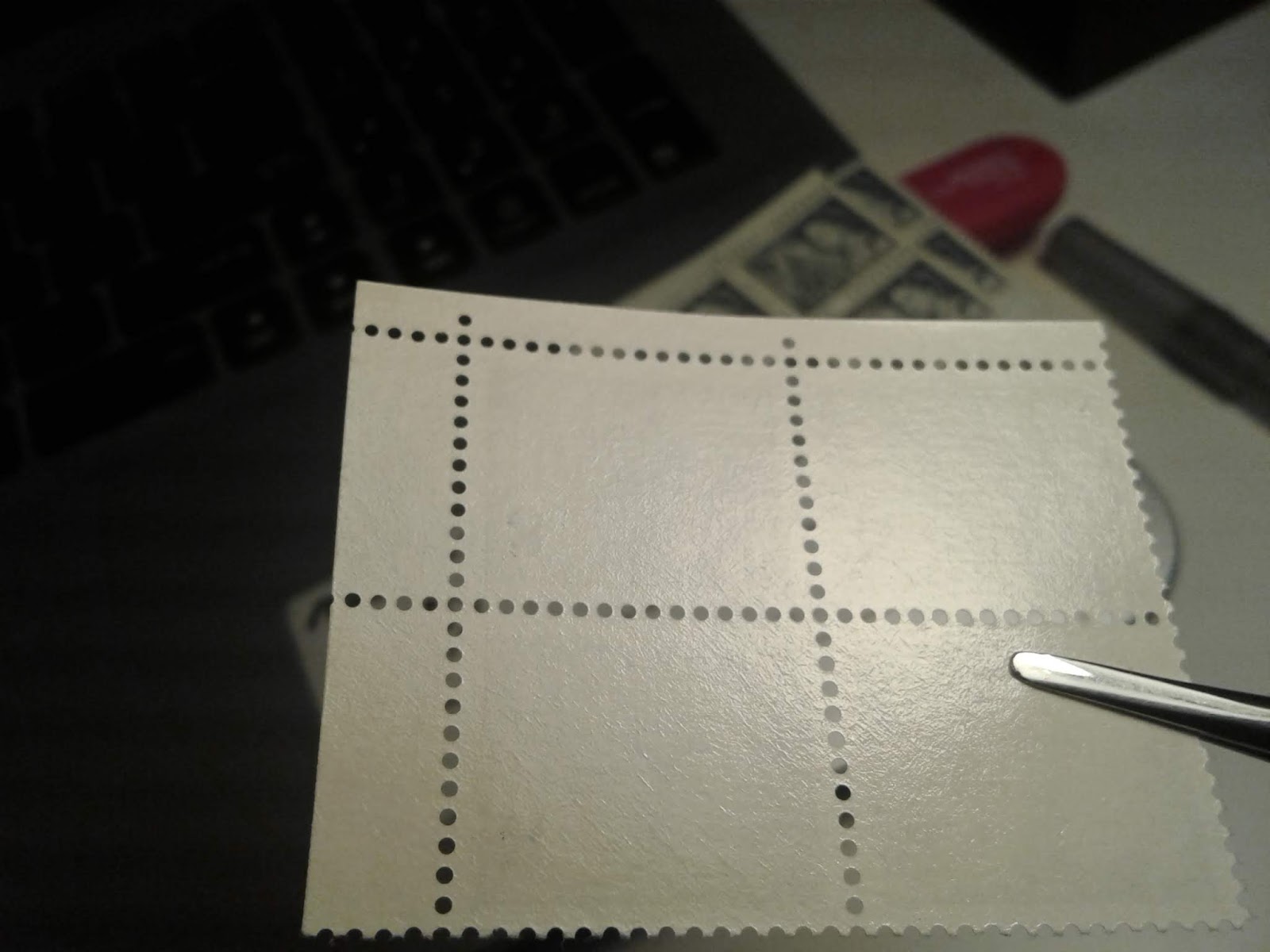 The tagging on the PVA gum printings is the same as for the dextrose gum printings. However, because of the fluorescence of the paper of most stamps that it appears on it is much more difficult to see. It usually appears as a slight dulling of the fluorescent effect on both sides of the stamp. The picture below shows how this tagging usually appears under UV light: