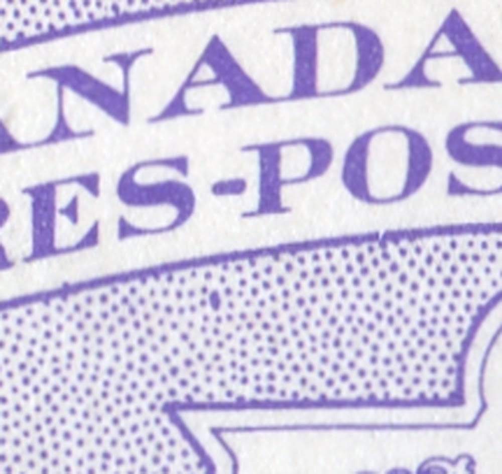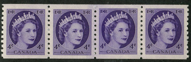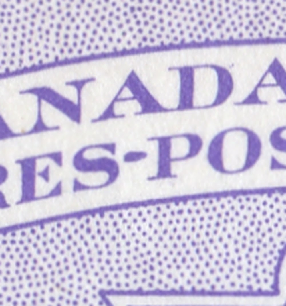In addition to this, the 2c exists on fluorescent paper, which is generally a dull paper with a sparse concentration of low fluorescent fibres. The 4c is listed on hibrite paper, but the ones I have seen are really just low to medium fluorescent. All of them appear to exist on three kinds of dull paper: smooth with no mesh, vertical ribbed as shown here and horizontal wove. Finally at least 2 shades of each value exist. So there are an additional ten varieties of 2c, an additional 10 of the 4c and 8 varieties of the 5c. When you combine those varieties with the 12 strip varieties above, the potential scope becomes: