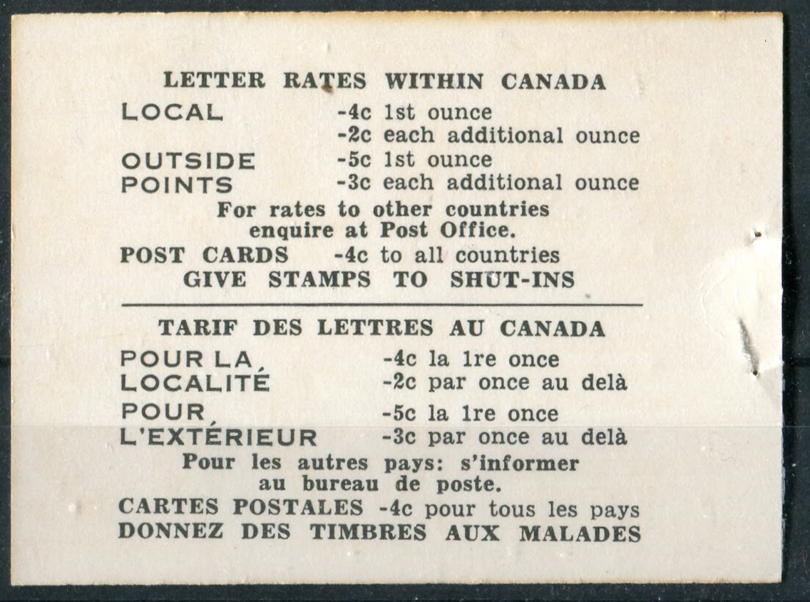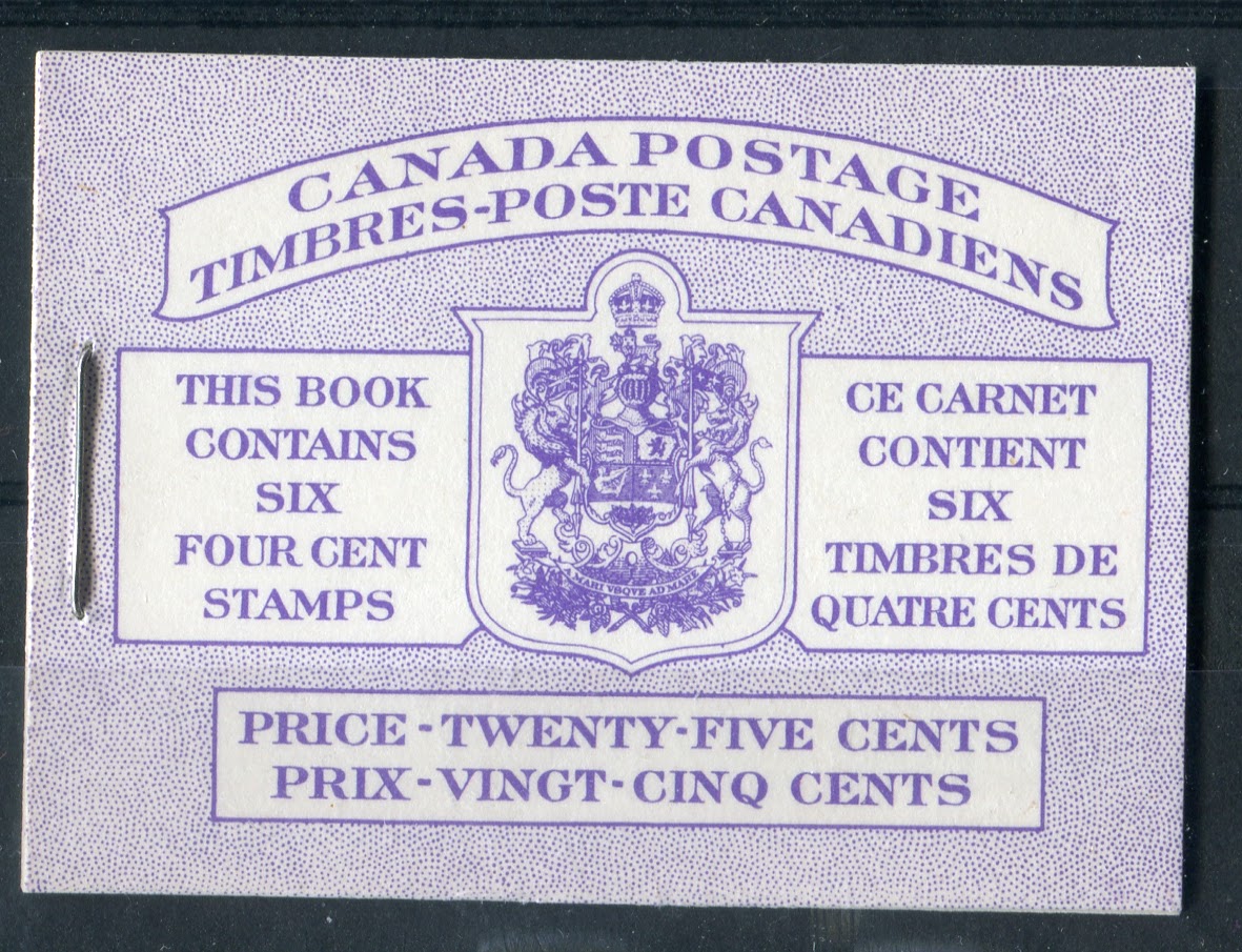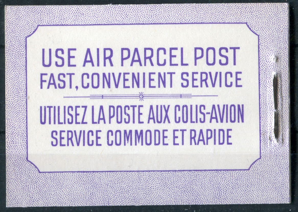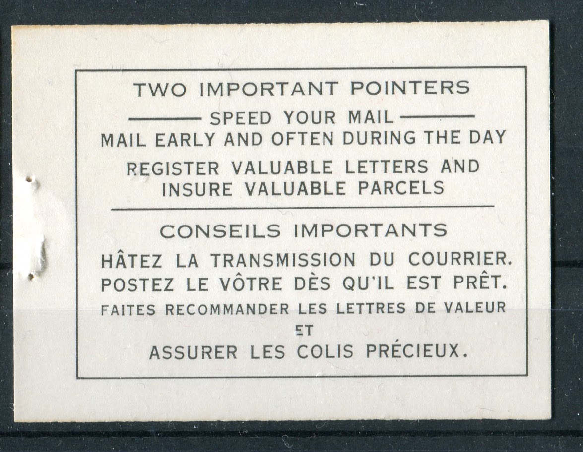 As stated in the earlier post about this issue, there were no English booklets, as all booklets starting with this issue are bilingual. There were also no chewing gum booklets as all booklets were the larger business-card sized 25c booklets. The dotted covers that had been in use since 1935 continued to be used on this issue until 1956, when they were replaced by a new modern design. As we shall see, between cover types, staple lengths, cutting guidelines, paper varieties and shades, there is a considerable amount of scope in collecting the booklets and panes that goes way beyond the basic four booklets that are listed in Unitrade.