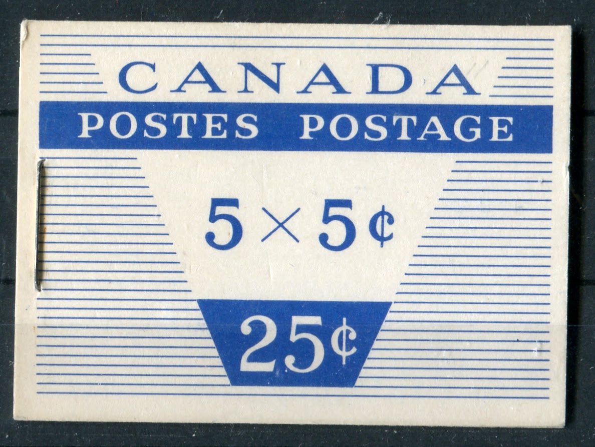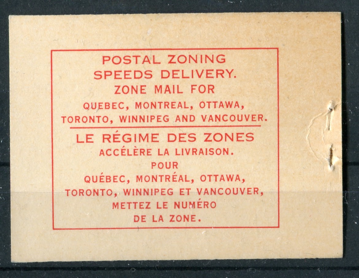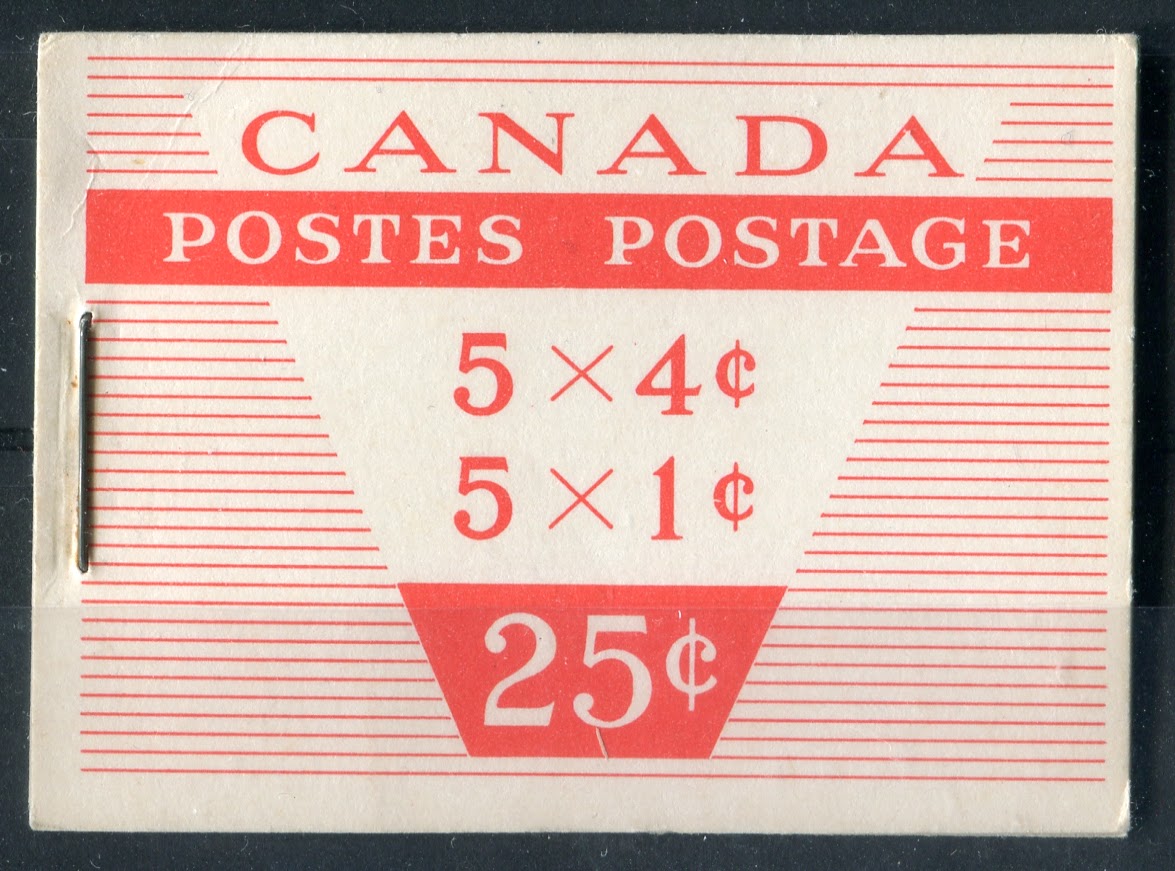 As stated in the earlier post about this issue, there were no English booklets, as all booklets starting with this issue are bilingual. There were also no chewing gum booklets as all booklets were the larger business-card sized 25c booklets. The dotted covers that had been in use since 1935 continued to be used on this issue until 1956, when they were replaced by a new modern design. As we shall see, between cover types, staple lengths, cutting guidelines, paper varieties and shades, there is a considerable amount of scope in collecting the booklets and panes that goes way beyond the basic four booklets that are listed in Unitrade.