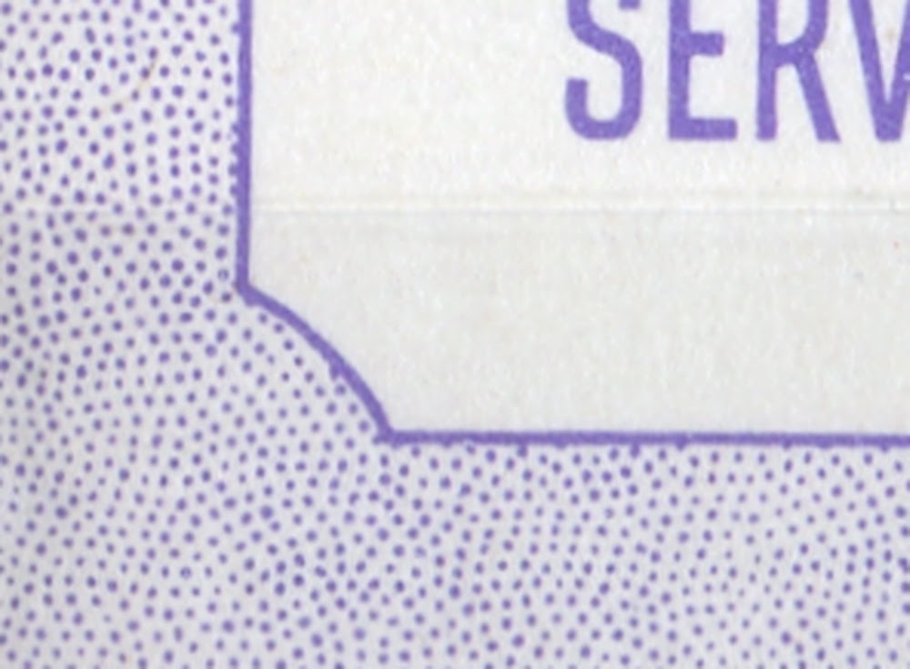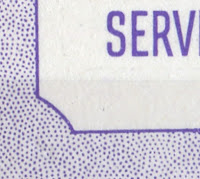 McCann also notes that all of the 25c blue booklets exist on horizontal ribbed and smooth papers. There are two fluorescent papers known on the blue booklets, medium and low fluorescent and the purple booklets have been seen with low fluorescent panes. This opens up the possibility of several different types of dull paper. Furthermore, all of these booklets exist with cutting guidelines in the upper or lower left corners. So this means that every single booklet can exist three ways: no guideline, guideline at upper left and guideline at lower right. So that means that there are at least 216 different types of blue booklet and 24 types of purple booklet.