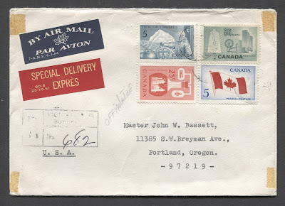 In addition to the first day covers, there are a large range of covers that can be collected for this issue, many of which will be mixed frankings consisting of the stamps of this issue and either commemoratives of the period, or the higher values from the earlier Wilding Issue, or all three. The above cover, for example is a nice overweight cover that once held a set of coins. It was sent in 1965 to Portland, Oregon. The high postage of 85 cents was paid using a combination of the earlier high value definitives and the current commemorative issues. There are many different ways that you can collect the covers of this period, and I will get into these in more detail over the coming weeks.