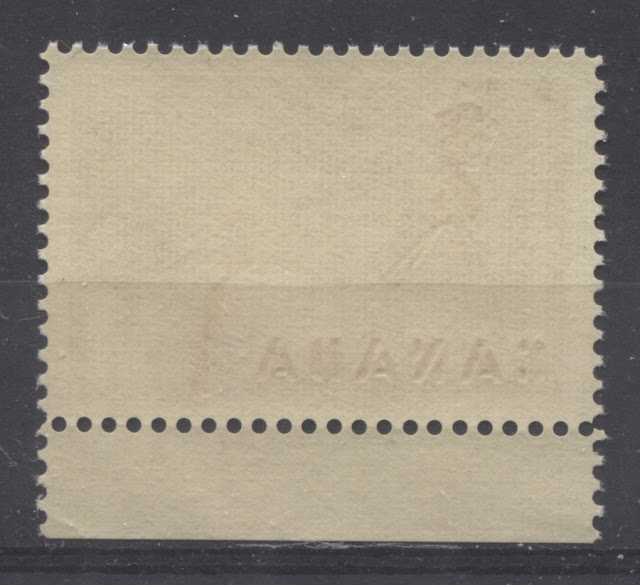 The above scan shows a second type of paper on which this stamp can be found. This is also a horizontal wove paper, but this one has no visible ribbing on the gum side and only a faint horizontal mesh is visible. The gum is also yellowish cream, but with a glossy sheen. Under long wave ultraviolet light the paper also gives a dull greyish reaction just like the first paper above. Like the first paper, this one also has a porous surface when viewed under a 10x loupe.