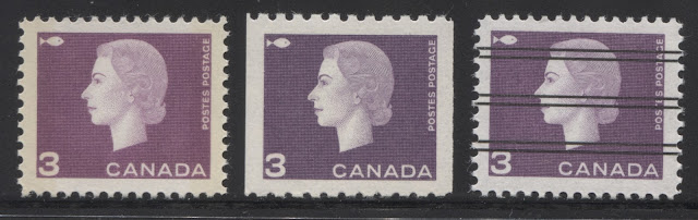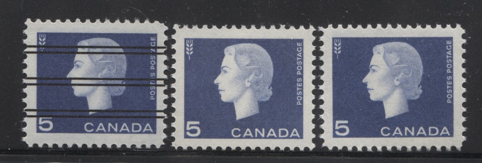 Then there are the majority of the tagged stamps, which had tagging that was very clearly visible, but which did not seriously discolour the stamps to which it was applied. From the back, however, the tagging bars could be seen. I call this type of tagging "moderate" tagging. Here is a strip of three 5c stamps showing moderate tagging: