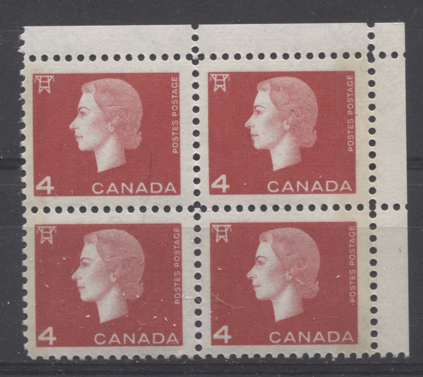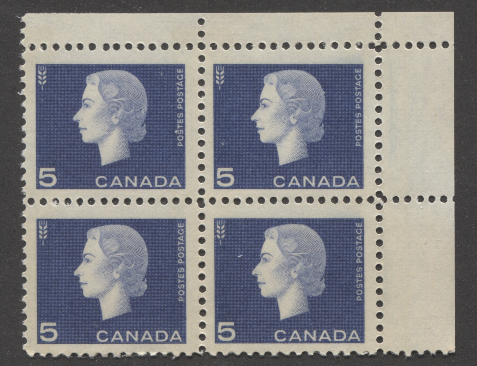 A lower left block showing an example of the 5 9 mm bars per pane. The selvage on this block is narrow on both sides which suggests that it cannot be from any of the lower panes in the sheet. Recall that these stamps were printed in layouts of 600 subjects in six panes of 100 stamps. Thus, the width of the selvage suggests that this must have come from either the upper centre pane, or the upper right pane.
