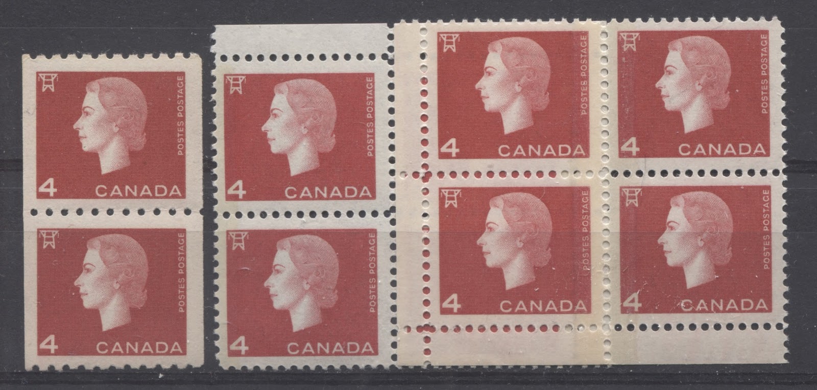 The above discussion of the tagging configurations for the various stamps assumes that the stamps have the tagging in the correct position. However, just like any printing ink, the tagging can become shifted over from where it should be. On the 4c, these errors will be difficult, if not impossible to distinguish from the regular centre bands in all cases except where the outer band on one of the centre panes where the outer bands are narrower becomes shifted, forming a centre band that is 7 mm wide. It can be distinguished from the regular centre bands in this case because of the smaller width. On all the other values, shifts will often result in stamps that have 1 bar tagging and an 8.5 mm centre band. These are quite scarce and highly sought after.