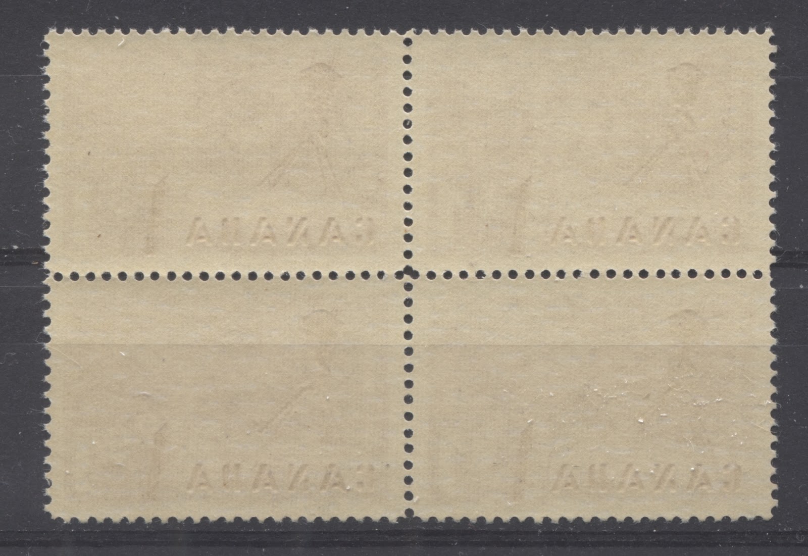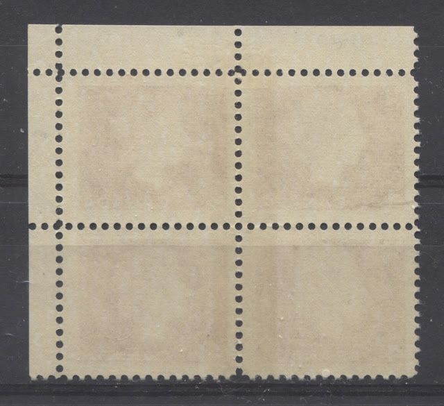 The fourth type of paper I have seen on this stamp is shown in the block above. Here there is no mesh visible at all, the paper appears off white in normal light, but gives a dull fluorescent greyish reaction under ultraviolet light. The surface is smooth but quite porous when viewed under a 10x loupe. It is horizontal wove paper and the gum is usually a smooth cream gum that has a satin sheen.