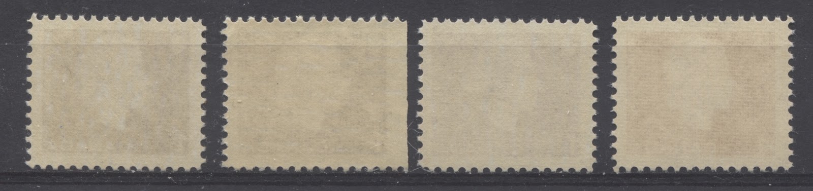 Finally, there is a sixth paper type that I have only found on the coil stamps of this issue. It is a horizontal wove paper, which shows very, very light horizontal ribbing on the gum side. The gum is deep yellowish cream, smooth and has a semi-gloss sheen. The paper surface on the printed side is both smooth and porous.